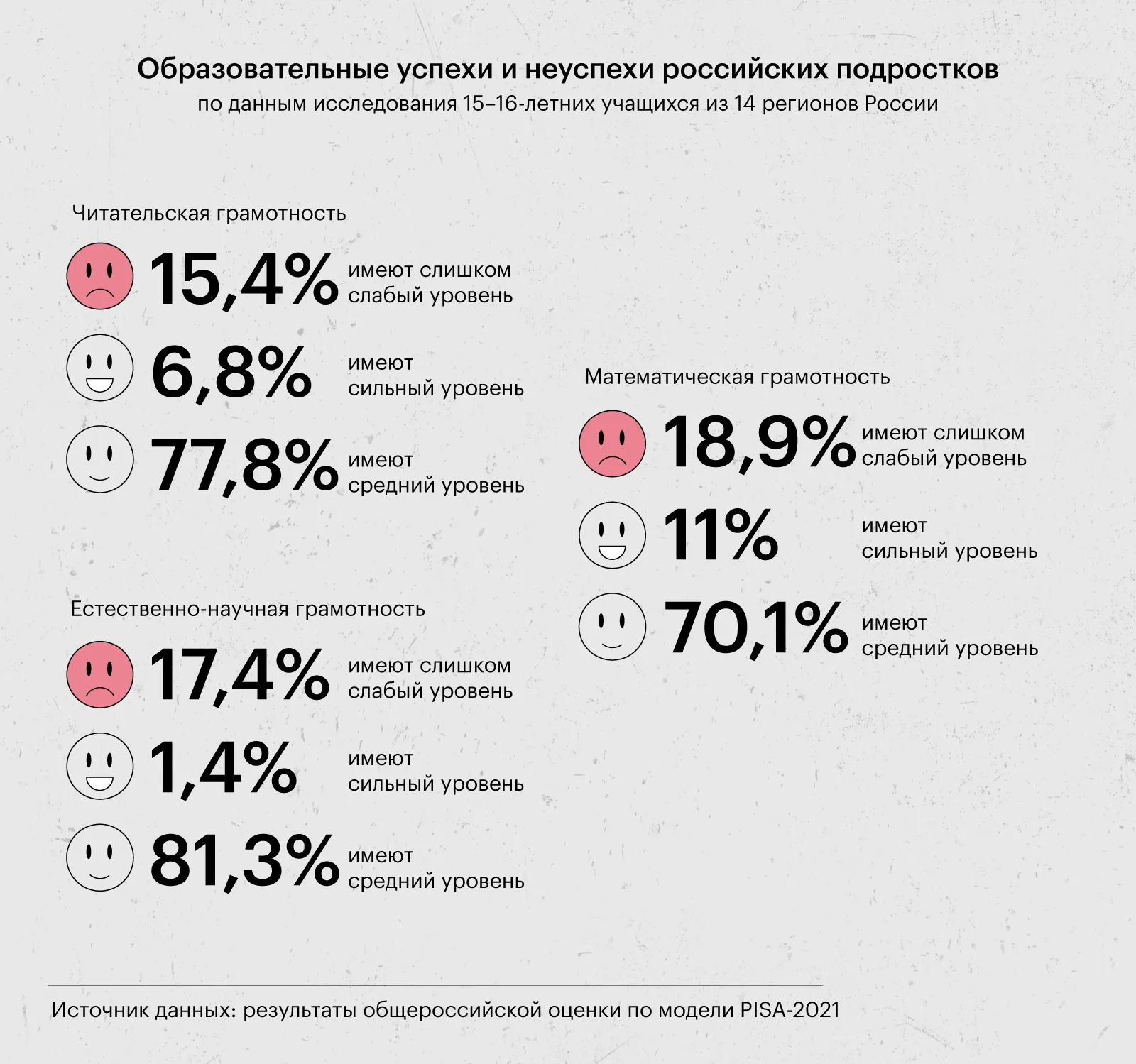 В исследовании PISA, как и в оригинальной версии, выделяются шесть уровней владения для каждой категории грамотности. Второй уровень считается пороговым: его недостижение указывает на недостаточно развитые базовые навыки. Таким образом, уровень два соответствует знаниям и компетенциям, которые можно оценить на уровне слабой троечки. На инфографике доля школьников, не достигнувших этого базового порога, обозначена как слишком низкий уровень. Это подчеркивает важность ранней диагностики и вмешательства для улучшения образовательных результатов.