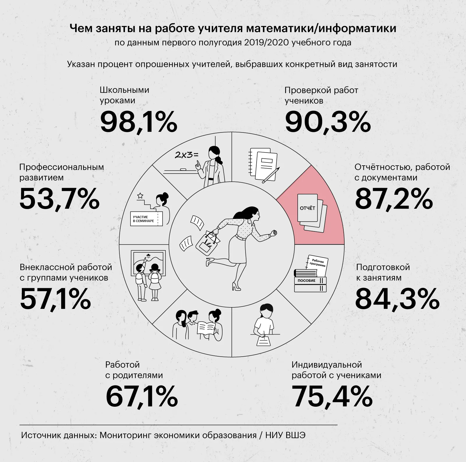 Высшая школа экономики выпустила новый информационный бюллетень в рамках Мониторинга экономики образования, который посвящён адаптивности и готовности школьных учителей к инновациям в условиях изменений. В бюллетене также представлен анализ рабочего времени педагогов. На иллюстрации показана нагрузка учителя математики (информатики), однако аналогичная ситуация наблюдается и у преподавателей других предметов, включая начальную школу. Примечательно, что среди различных видов рабочих задач на третьем месте находится отчётность, которая не должна занимать центральное место в деятельности учителя. Кроме того, от 67 до 74% учителей в зависимости от стажа работы признались, что им не хватает времени на подготовку к урокам. Это подчеркивает необходимость пересмотра подходов к рабочей нагрузке педагогов для повышения их эффективности и качества образования.