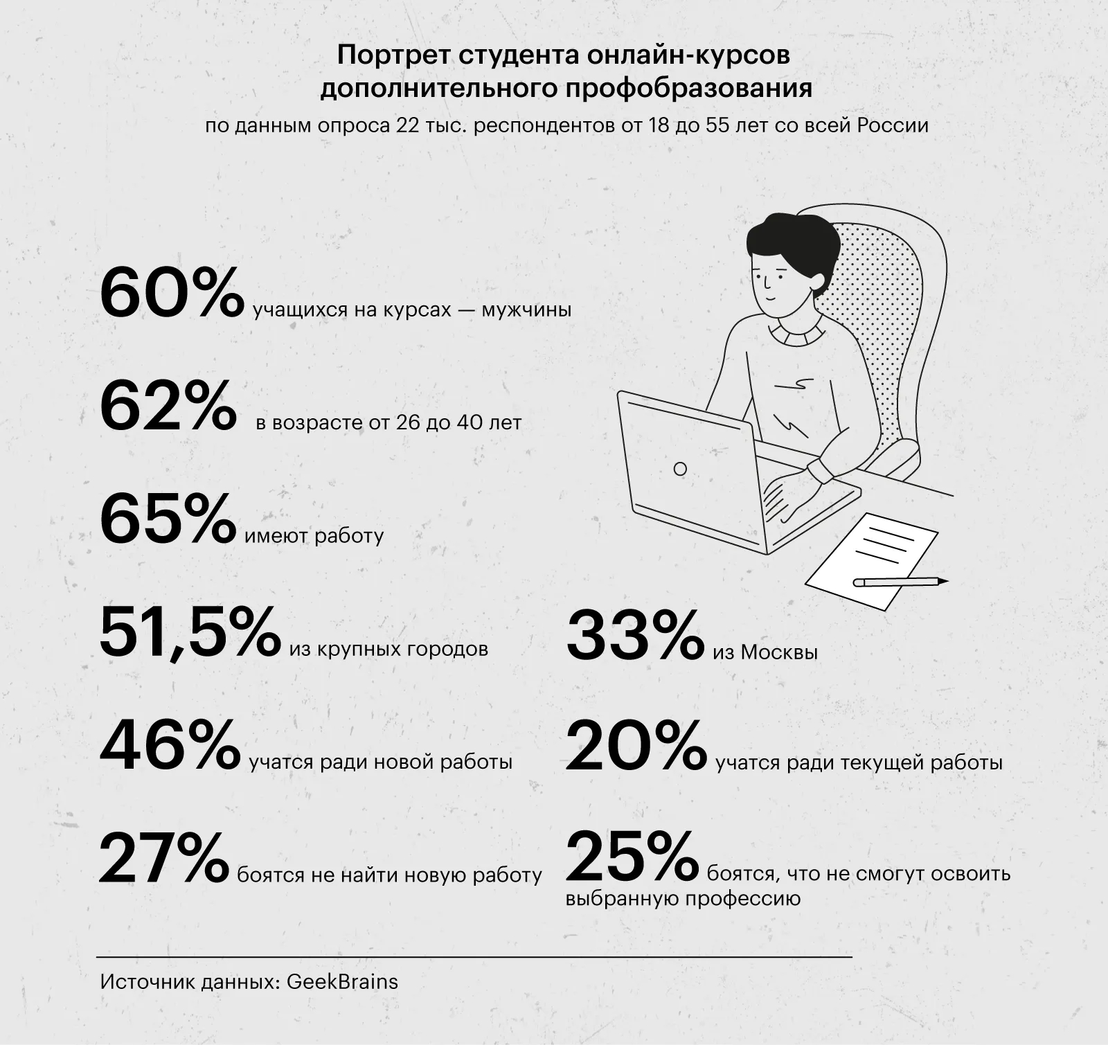 Образовательная платформа GeekBrains провела опрос среди более чем 22 тысяч респондентов в возрасте от 18 до 55 лет по всей России, чтобы выяснить их опыт обучения на онлайн-курсах дополнительного профессионального образования. Результаты исследования, а также их сопоставление с данными других исследований в области онлайн-образования для взрослых, представлены в нашем материале. На инфографике отображены ключевые характеристики типичных представителей данной аудитории, полученные в результате опроса GeekBrains.