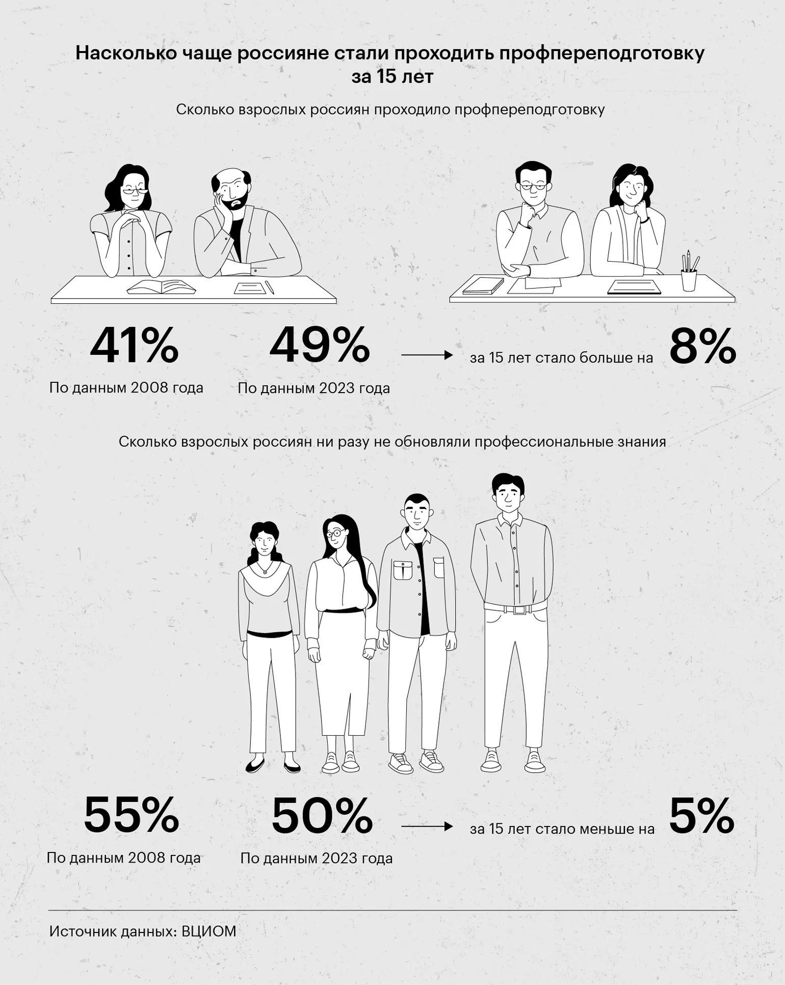 В августе ВЦИОМ провёл опрос на тему образования, сравнив его результаты с аналогичным исследованием 2008 года. Выяснилось, что за последние 15 лет доля взрослых, прошедших профессиональную переподготовку после получения основного образования, увеличилась, однако этот рост составил всего 9%.