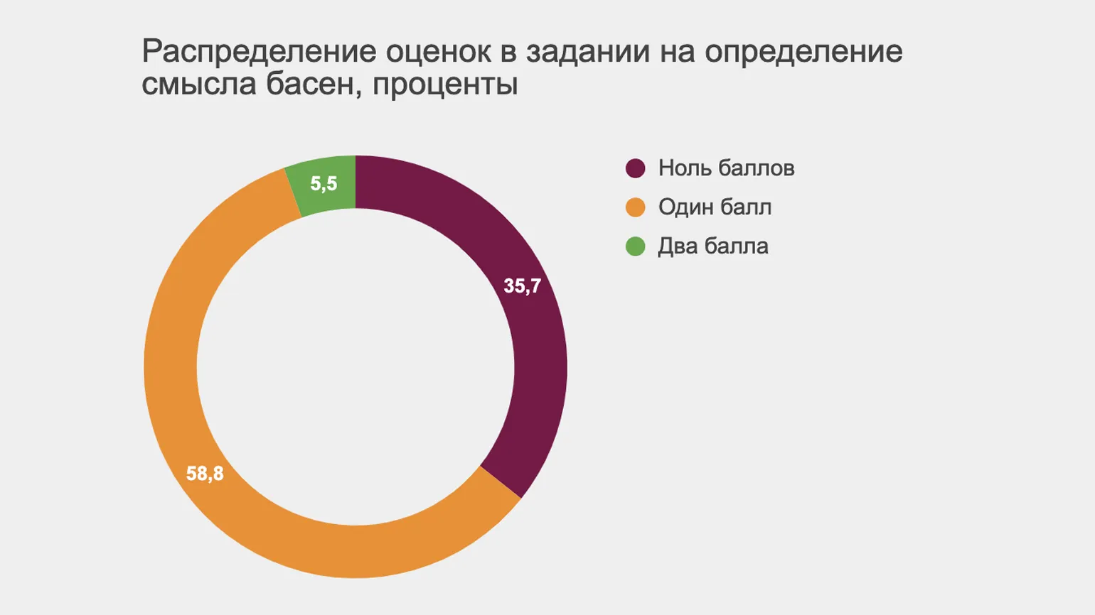 Большинство интерпретаций, а именно 58,8%, исследователи оценили на минимальный балл. Это означает, что они либо находились на поверхностном уровне, либо содержали обобщения с ошибками. Лишь 5,5% трактовок демонстрировали глубокое понимание смысла басни.