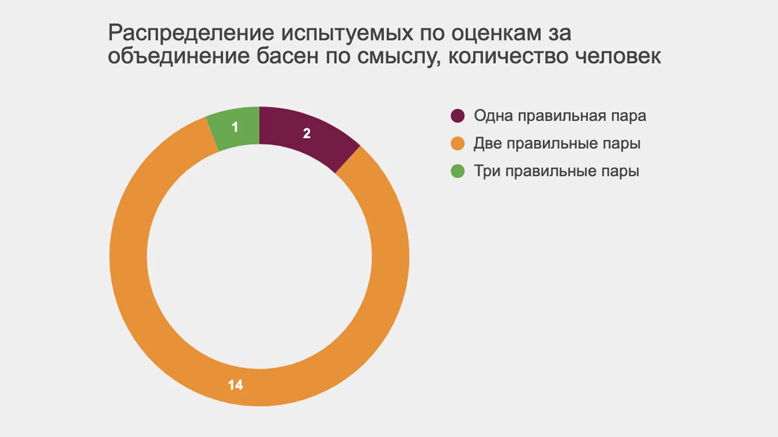Исследование показало, что 65% пар, составленных участниками на основе смыслового сходства, были правильными. Каждый испытуемый смог правильно соединить хотя бы одну пару из трех предложенных наборов. Тем не менее, только один участник успешно объединил басни во всех трех наборах, в то время как большинство справилось лишь с двумя.