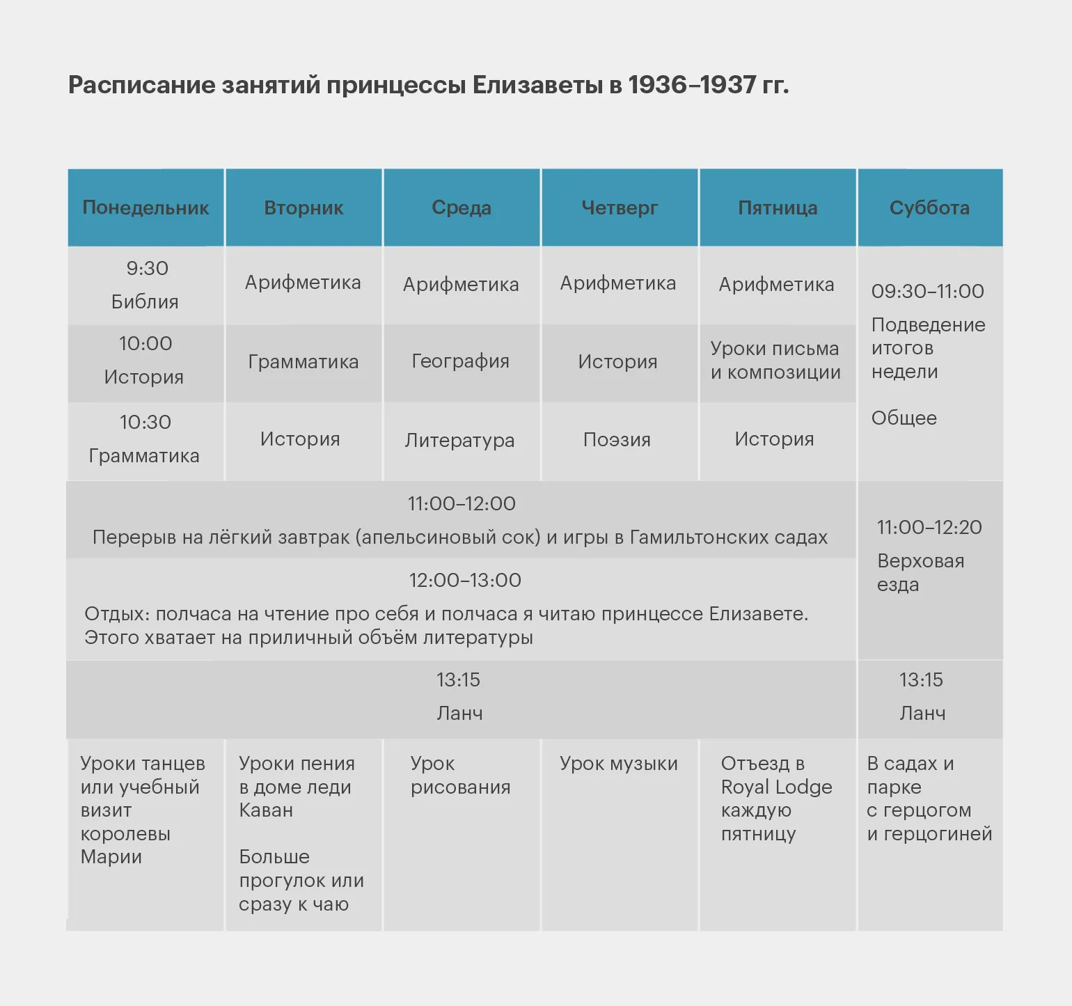 Королеве не понравилось, что на изучение Библии, литературы и географии выделялось недостаточно времени. Это ограничение влияло на образовательный процесс и развитие знаний, что вызывало беспокойство о качестве образования. Важно обеспечить достаточное время для изучения этих дисциплин, так как они играют ключевую роль в формировании общего кругозора и культурного фона.