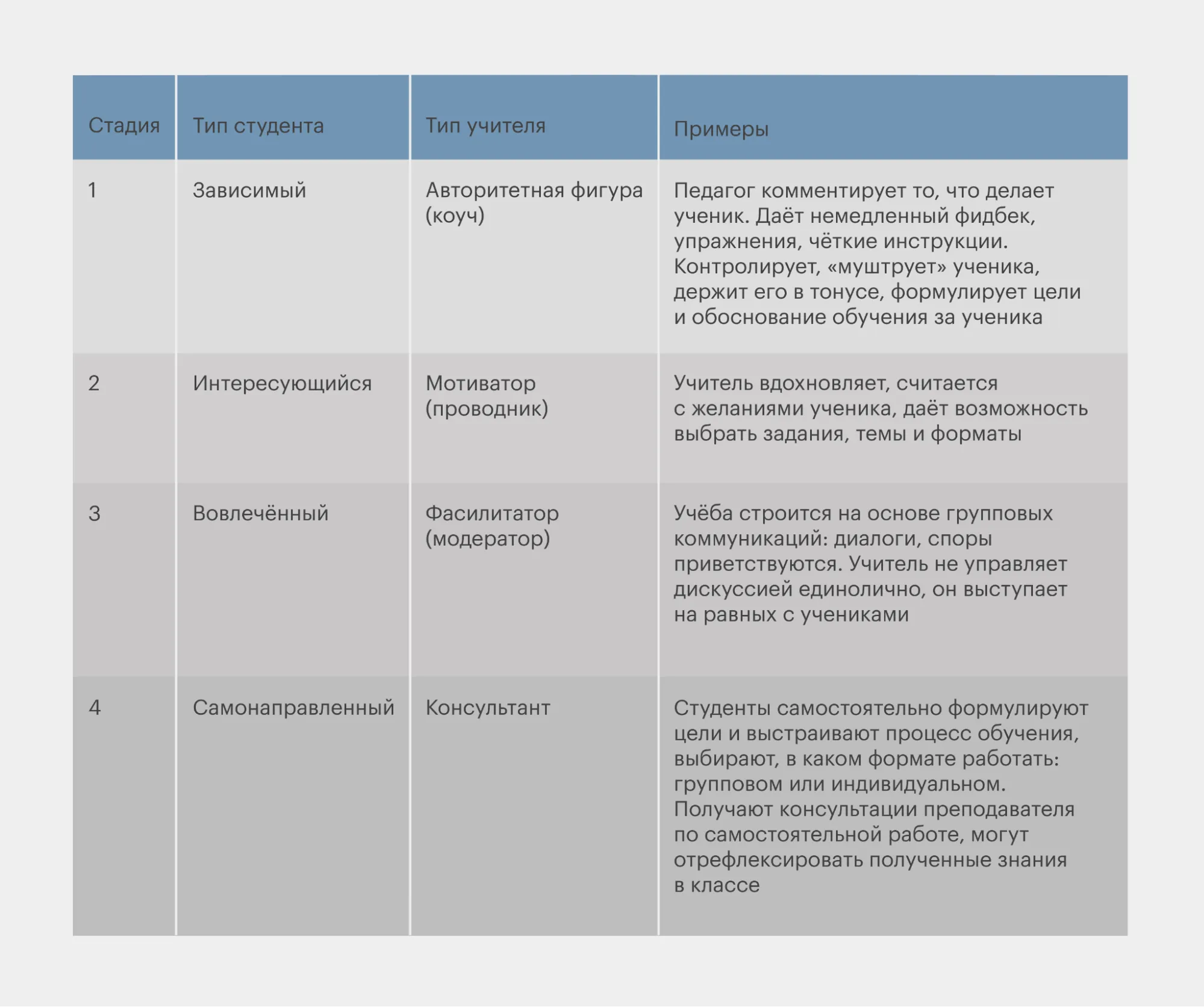 Этот процесс включает несколько этапов. На первой стадии ученик зависит от преподавателя, обладая ограниченными знаниями и неопределенными ожиданиями от учебного материала. По мере продвижения по стадиям, учащийся начинает формулировать свои образовательные цели и развивает навыки самостоятельного обучения. В конечном итоге он достигает четвёртой стадии, на которой становится полноценным соавтором курса, активно участвуя в процессе обучения и принимая ответственность за своё образование.