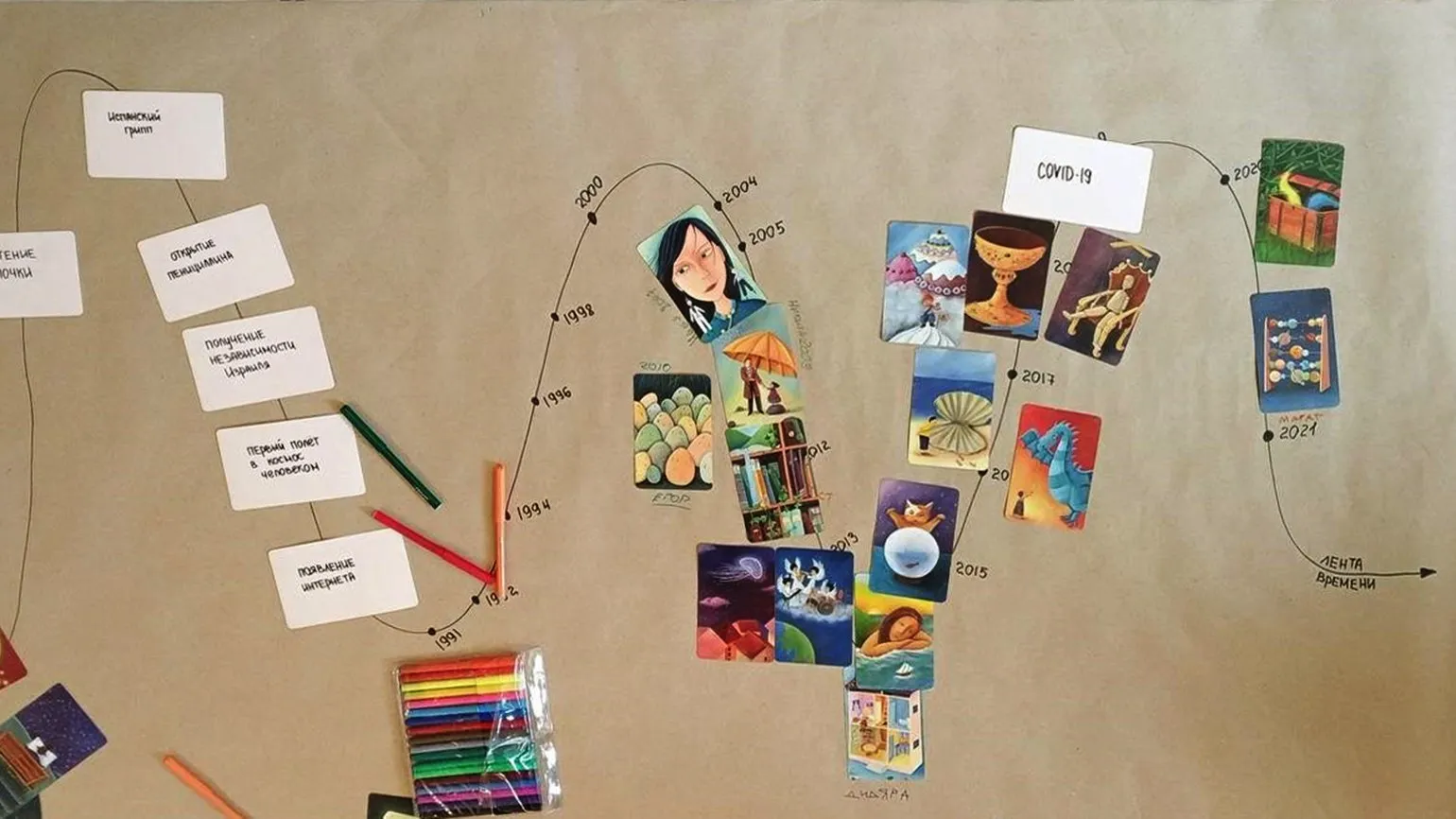 Участники использовали клубок ниток для соединения своих изобретений. Это занятие оказалось увлекательным, так как пространство заполнилось паутиной из нитей, и приходилось пробираться сквозь эти «связи». Участники могли легко исправить ошибки и изменить положение нитки, что позволило избежать необходимости точно знать все даты. Кроме того, наглядность процесса помогала участникам быстро понять последовательность событий и взаимосвязи между изобретениями.