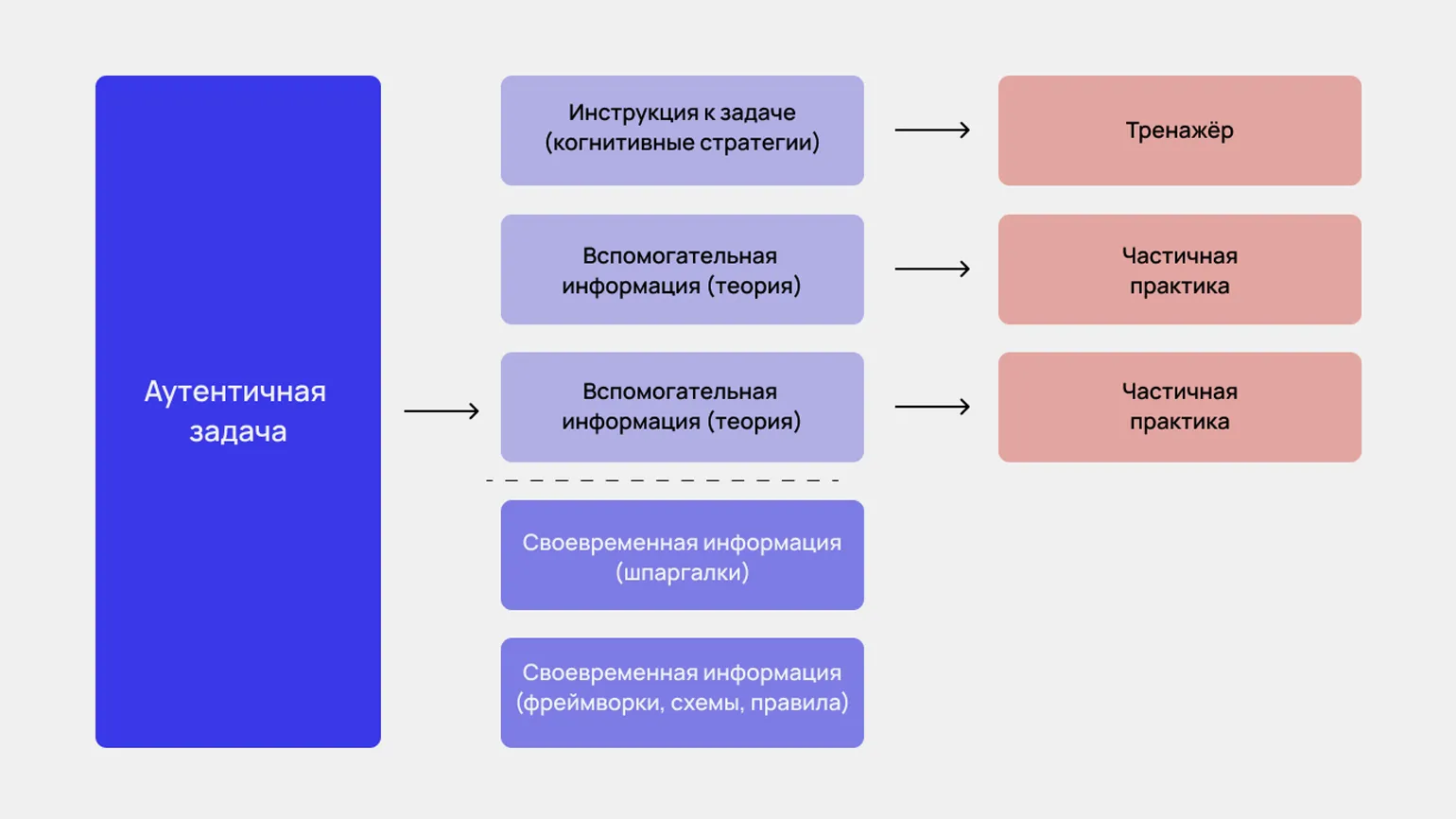 Каждая задача, которую мы предоставляем студенту, сопровождается учебными материалами, что является стандартной практикой. Эти материалы делятся на несколько компонентов, которые в целом соответствуют модели 4C/ID, но в нашей интерпретации они взаимодействуют друг с другом. Такой подход позволяет создать интегрированное учебное пространство, где студенты могут более эффективно усваивать информацию и применять полученные знания на практике.