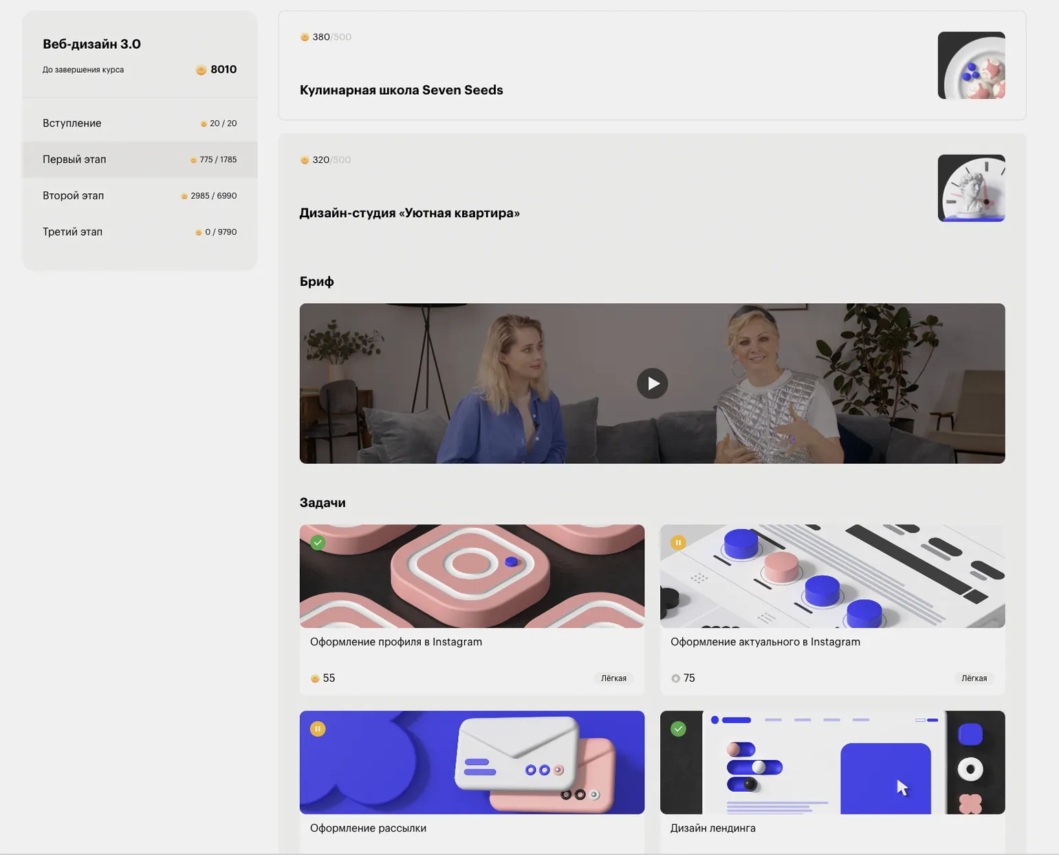 Пользователь, впервые открыв новую LMS, сталкивается с страницей онбординга и видеогидом, объясняющим процесс прохождения курса и организацию работы с учебными материалами. После этого он переходит на страницу с кейсами, где к каждому расположен привлекательный видеобриф, созданный для того, чтобы студенты заинтересовались потенциальными проектами. К задачам прилагается детальное объяснение требований для их выполнения, а также традиционные уроки для более глубокого понимания материала.