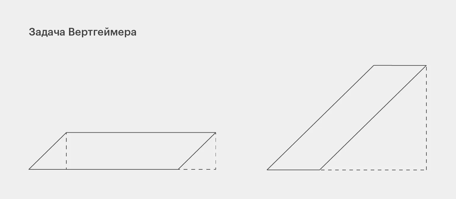Замечательный психолог Макс Вертгеймер на школьном материале демонстрировал уникальные аспекты и ошибки мышления, которые он изучал. Одной из его известных демонстраций является следующий пример. Ученики гимназии показывают свои знания о том, как измеряется площадь параллелограмма. Они рисуют стандартный параллелограмм с горизонтально расположенной длинной стороной и успешно демонстрируют правильное решение задачи. Такой подход к обучению позволяет не только усваивать теоретические знания, но и развивать критическое мышление, что особенно важно в образовательном процессе.