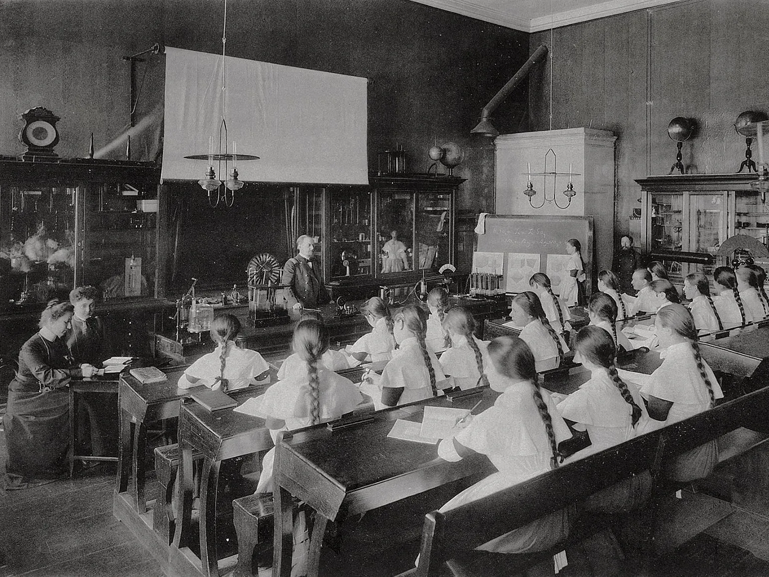 Урок физики, Смольный институт, 1905 год Фото: «Императорское воспитательное общество благородных девиц в Смольном в Петербурге» / Товарищество Р. Голике и А. Вильборг / РНБ / НЭБ
