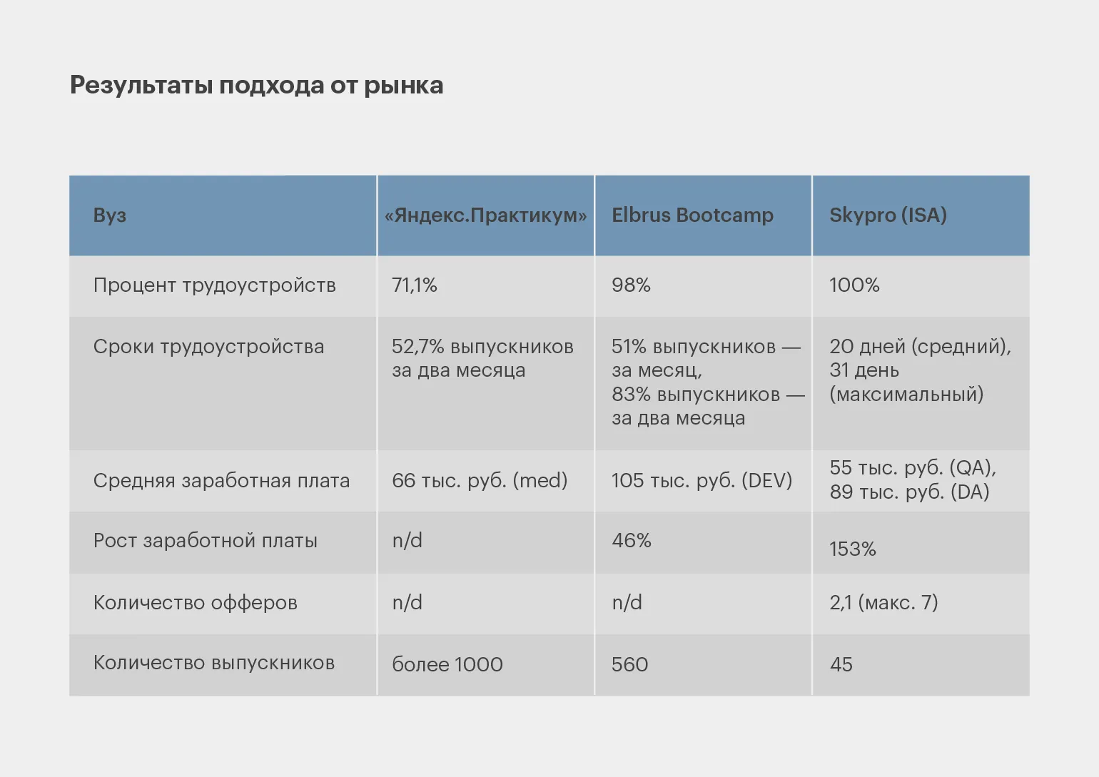Ситуация с EdTech выглядит иначе. Я провел анализ данных по трудоустройству от «Яндекс.Практикума», Elbrus Bootcamp и Skypro в рамках программы ISA, используя исследования, проведенные Институтом образования НИУ ВШЭ. Эти данные доступны для изучения и представляют интерес для анализа эффективности образовательных программ в области технологий.