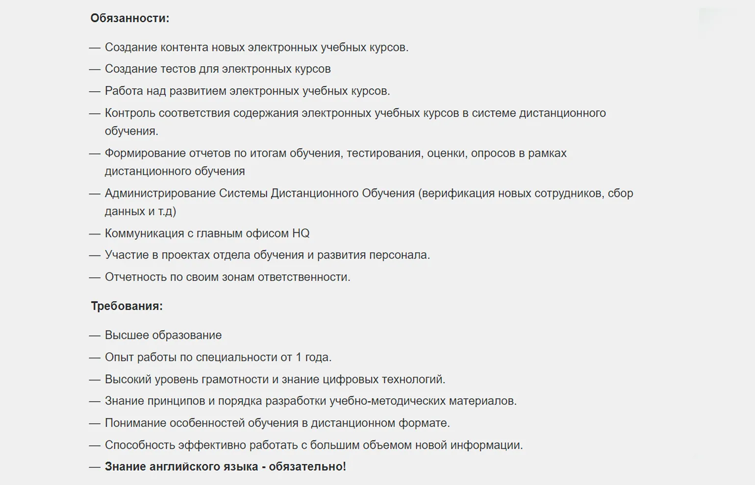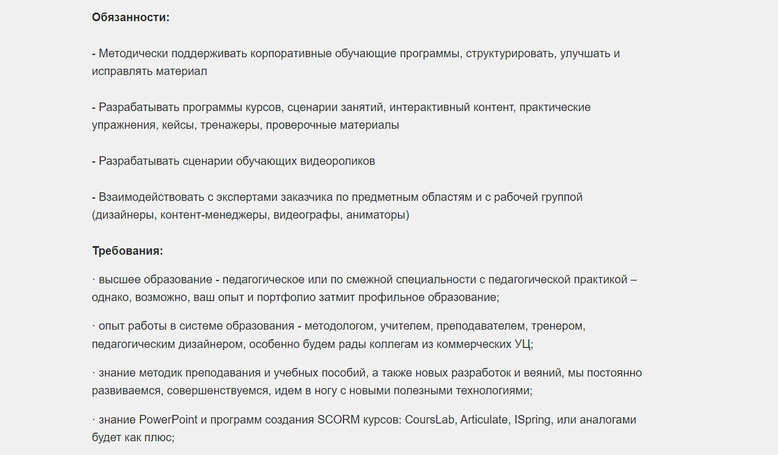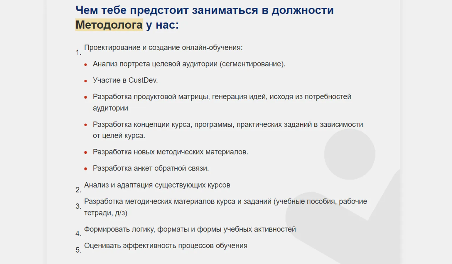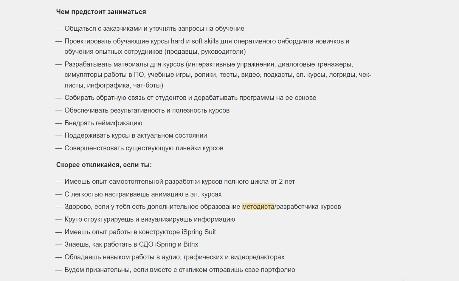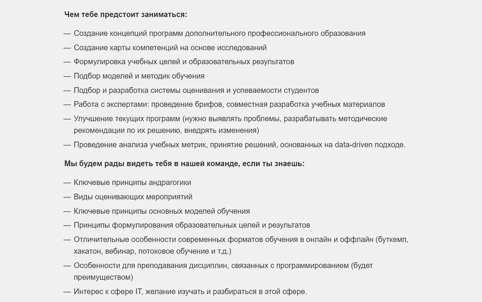 - Уметь разрабатывать учебные программы — то есть знать, на основе каких продуктовых подходов строится процесс создания курса, а также по каким логическим принципам собирается учебный материал курса (не факт, что методолог будет делать курсы и собирать к ним материалы сам, но если он задаёт общие правила методистам для этой работы, он и сам должен отлично их знать).
