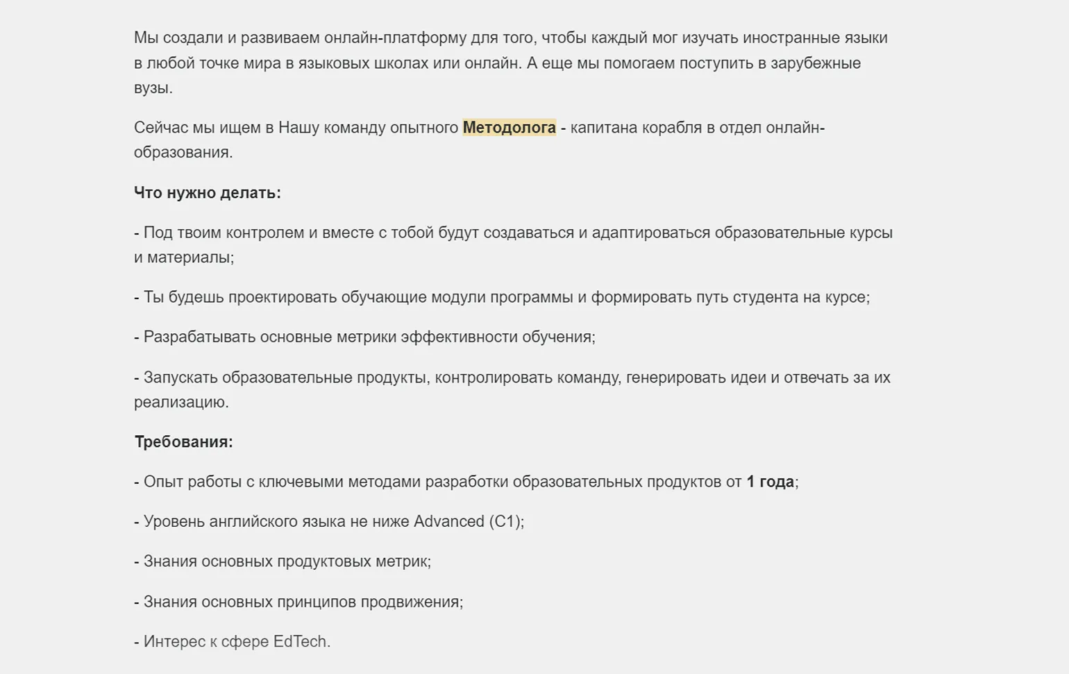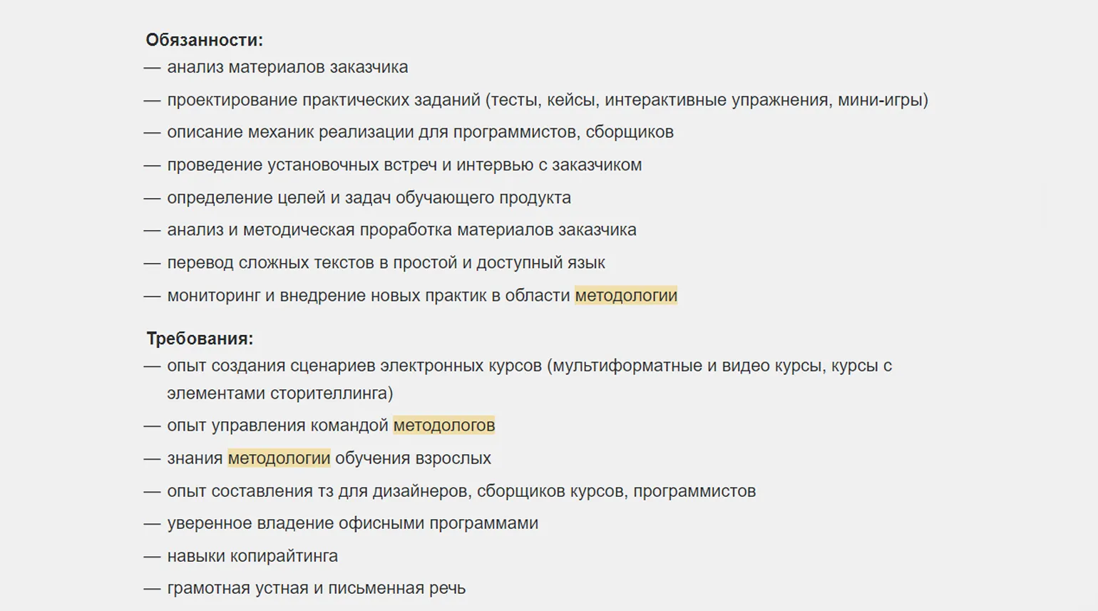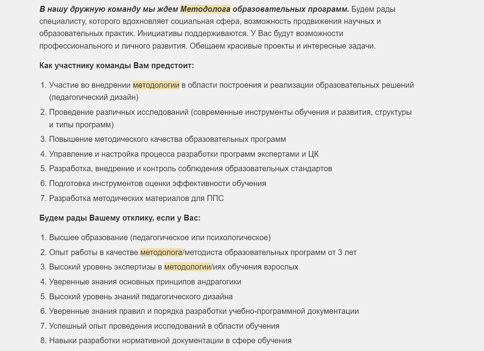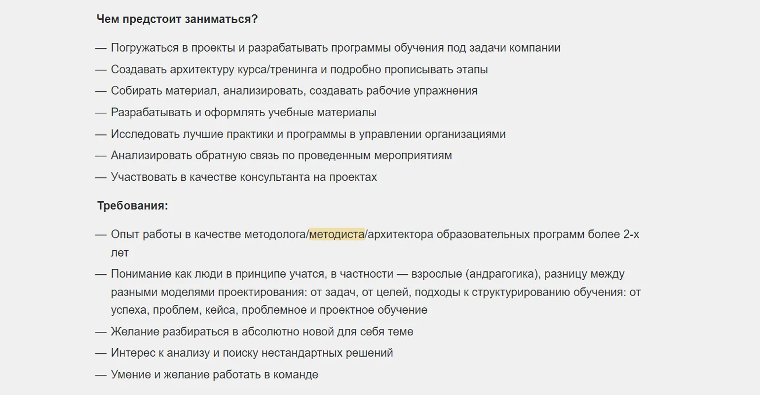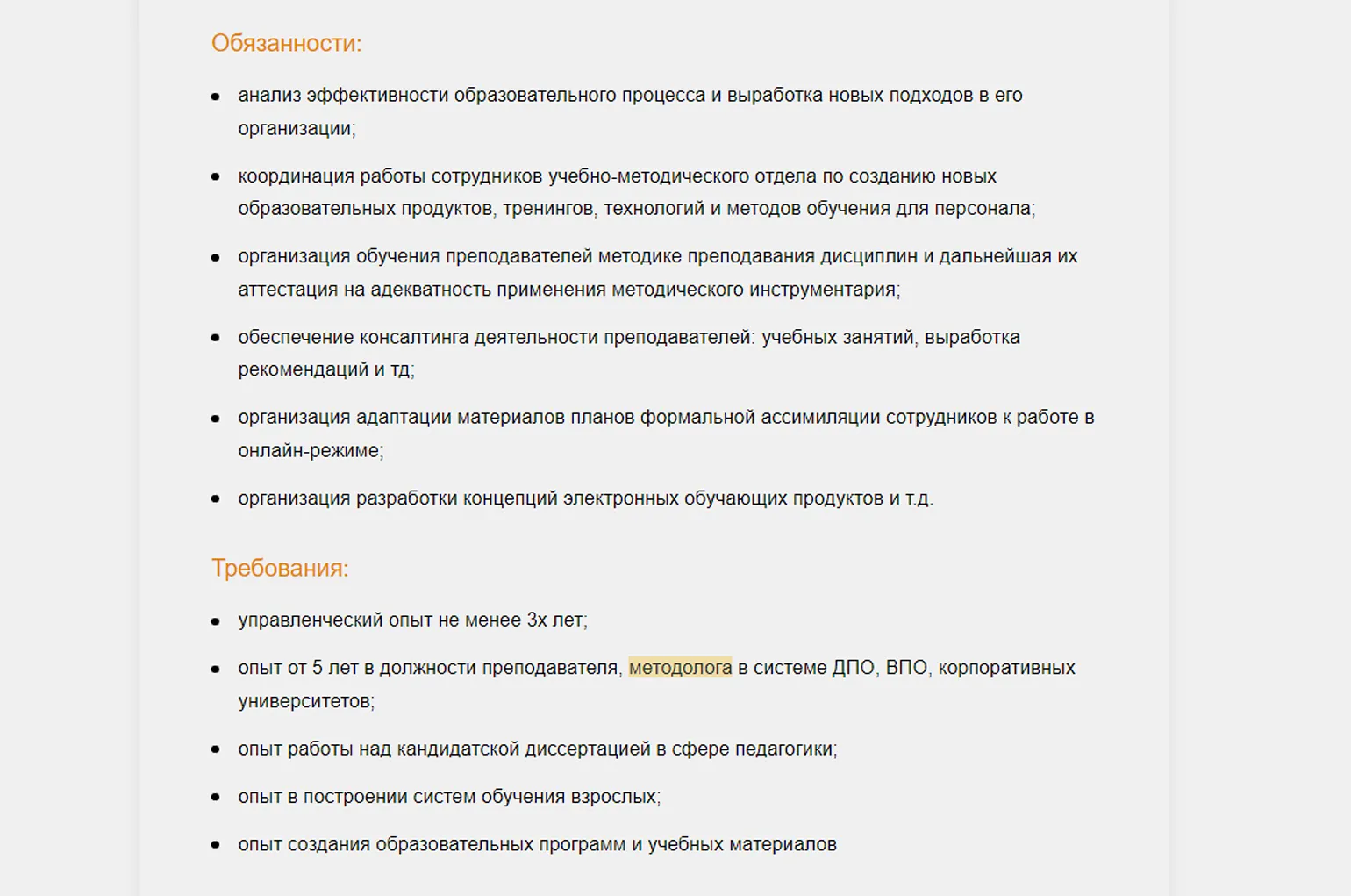 Если отобрать вакансии с использованием слова «методолог» на крупных порталах по поиску работы, можно заметить, что это обозначение используется чаще всего в следующих контекстах: