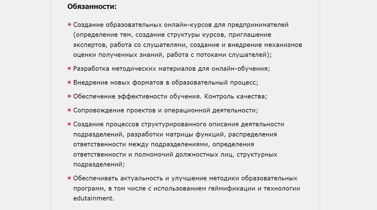 В данном тексте представлены описания четырех вакансий, связанных с методологией и обучением в образовательной сфере. Вакансии включают позиции «Начальник отдела методологии», «Руководитель отдела методологии и обучения», «Методолог образовательных программ» и «Методолог / Продюсер образовательного продукта». Каждая из этих ролей предполагает ответственность за разработку и внедрение образовательных стратегий и методик, а также за координацию процессов обучения и методологической поддержки. Ключевые требования к кандидатам включают опыт работы в сфере образования, умение разрабатывать учебные программы, а также навыки управления проектами и командой. Эти вакансии подчеркивают важность качественной методологической поддержки для достижения высоких результатов в образовательном процессе.