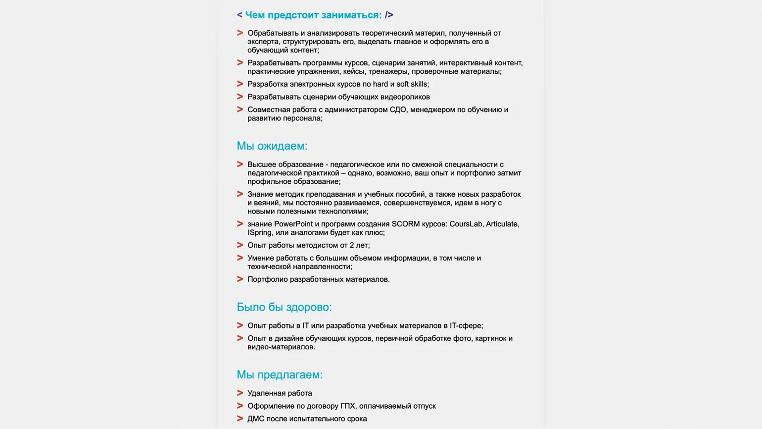 Мы подошли к роли методистов, занимающихся разработкой онлайн-курсов в различных областях знаний, навыков и компетенций. В этой сфере методистов могут называть по-разному: методист, педагогический дизайнер, архитектор обучения, проектировщик учебных программ, разработчик или сценарист онлайн-курсов. Их задача заключается в создании эффективного и engaging контента, который помогает обучающимся осваивать новые знания и навыки. Методисты учитывают потребности целевой аудитории и применяют современные технологии для улучшения образовательного процесса.