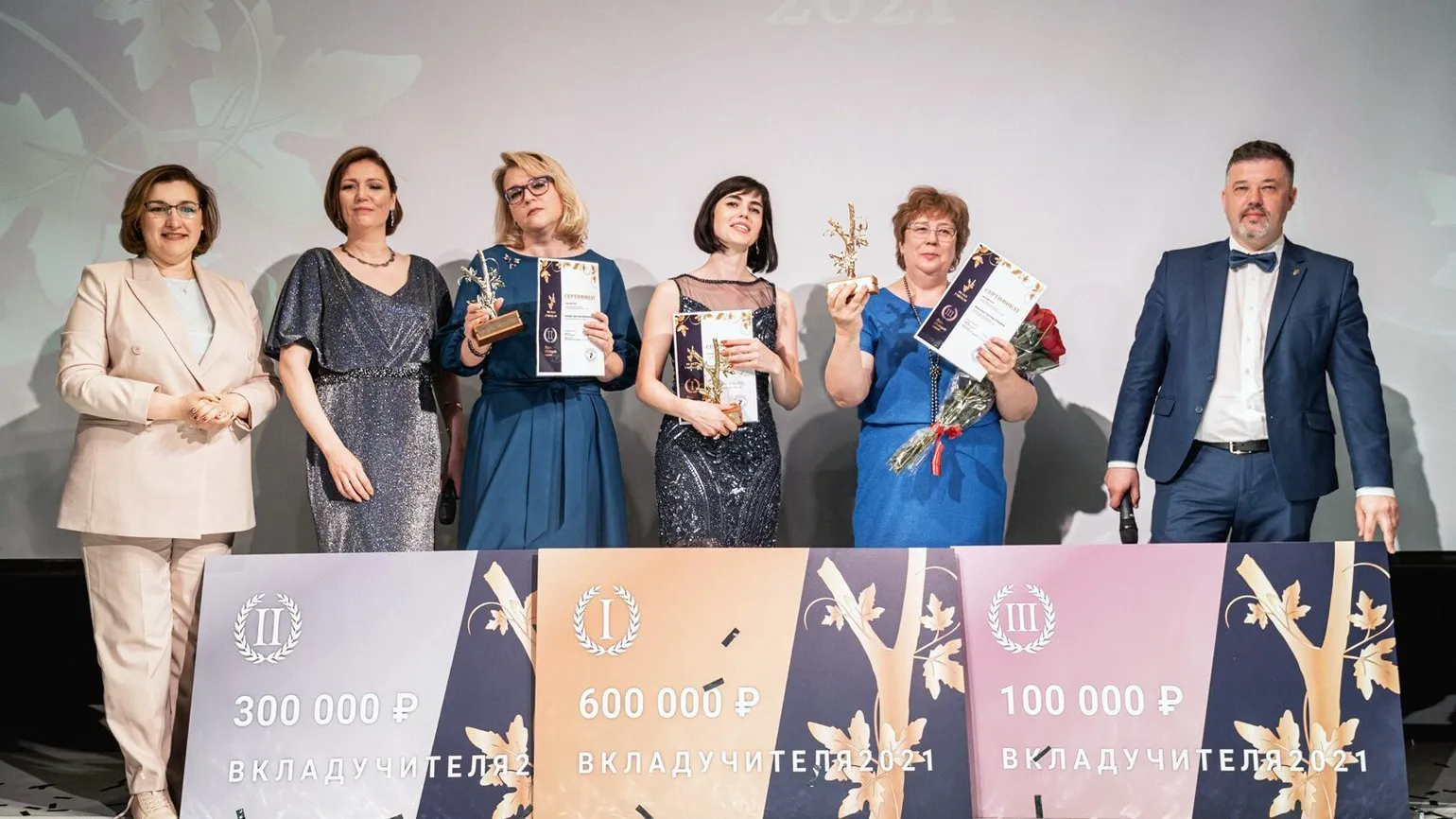 Победительница конкурса «Вклад учителя — 2021» Ольга Сорока (четвёртая слева) на вручении наград с финалистами и членами жюриФото: НОЧУ «СОШ „Феникс““ и АНОО „Школа имени А. М. Горчакова“