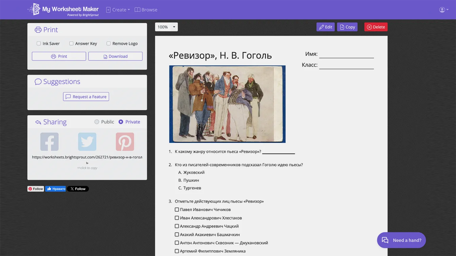 Это обширная библиотека рабочих листов, охватывающая различные предметы и классы. Однако стоит отметить, что весь контент представлен на английском языке, и лишь ограниченное количество материалов доступно бесплатно. В открытом доступе также имеются генераторы, которые позволяют создавать рабочие листы без необходимости регистрации.