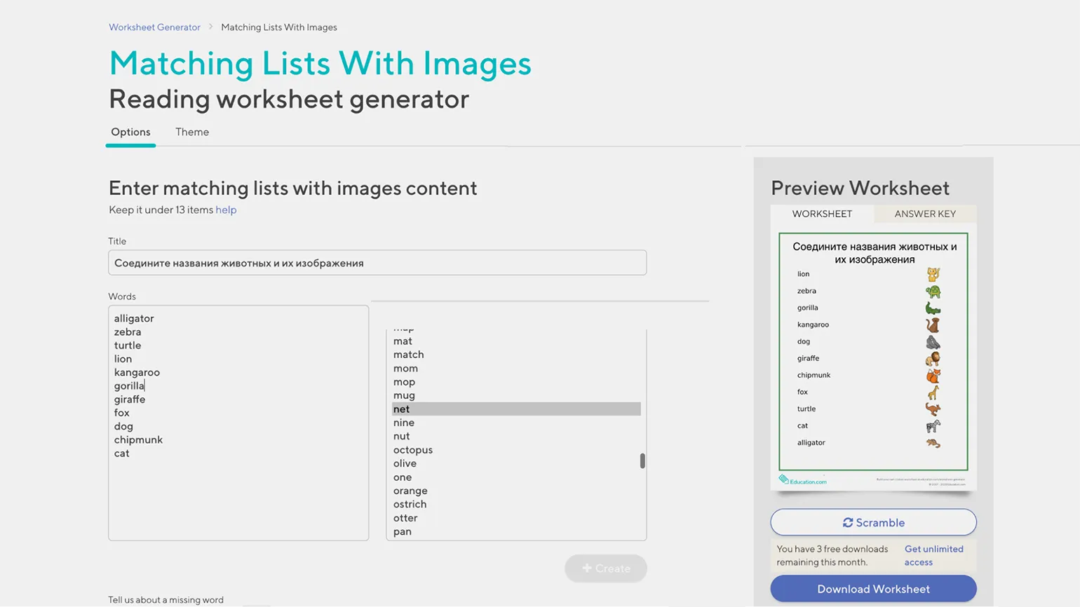 Платформа Education.com предлагает обширные ресурсы для учителей, включая интерактивные материалы, уроки, игры и задания. Однако большинство из этих ресурсов доступны только по платным тарифам. Бесплатно можно использовать генератор рабочих листов, но с ограничением — в месяц разрешено сохранять только три документа для распечатки. Если требуется больше сохранений, можно зарегистрироваться с помощью другого адреса электронной почты, чтобы обойти лимит.