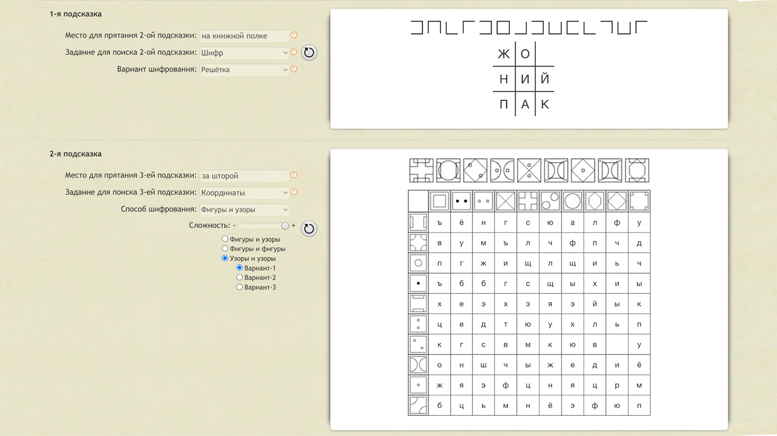 Педагогу достаточно тщательно продумать локации для головоломок с подсказками, а также ввести названия этих мест, выбрать способы шифрования и определить уровень сложности. Платформа «Квестодел» предлагает разнообразные виды шифров, например, шифр Цезаря, при котором каждая буква ключевого слова смещается по алфавиту вправо на определённое количество позиций. В других типах шифрования может потребоваться решение математических задач, работа с квадратом Полибия, использование кодов, таких как азбука Морзе или семафорная азбука. Для младших учеников предусмотрены более простые варианты, включающие загадки, ребусы, лабиринты, перемешивание букв и визуальные искажения искомых слов. Эти элементы делают занятия не только увлекательными, но и способствуют развитию логического мышления и творческих навыков у детей.