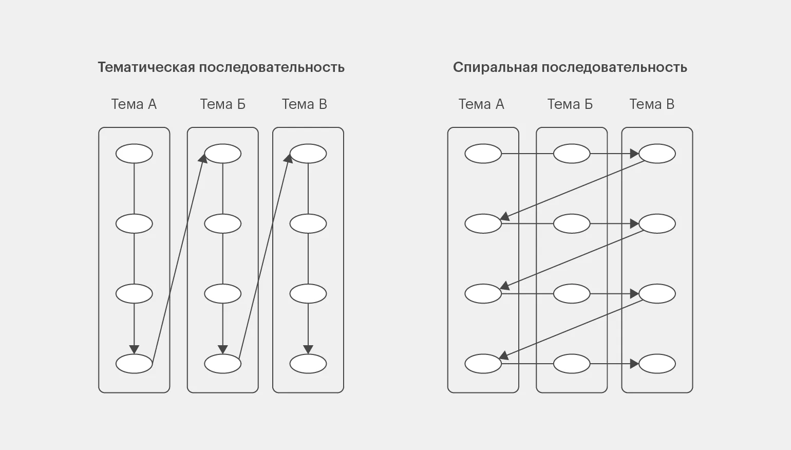 Тематическая и спиральная последовательность. Источник: Elaboration Theory: Scope and sequence decisions for quality instruction («Теория разработки: решения, касающиеся объёма и последовательности, для качественного преподавания»), Чарльз РейгелутИнфографика: Майя Мальгина для Skillbox Media