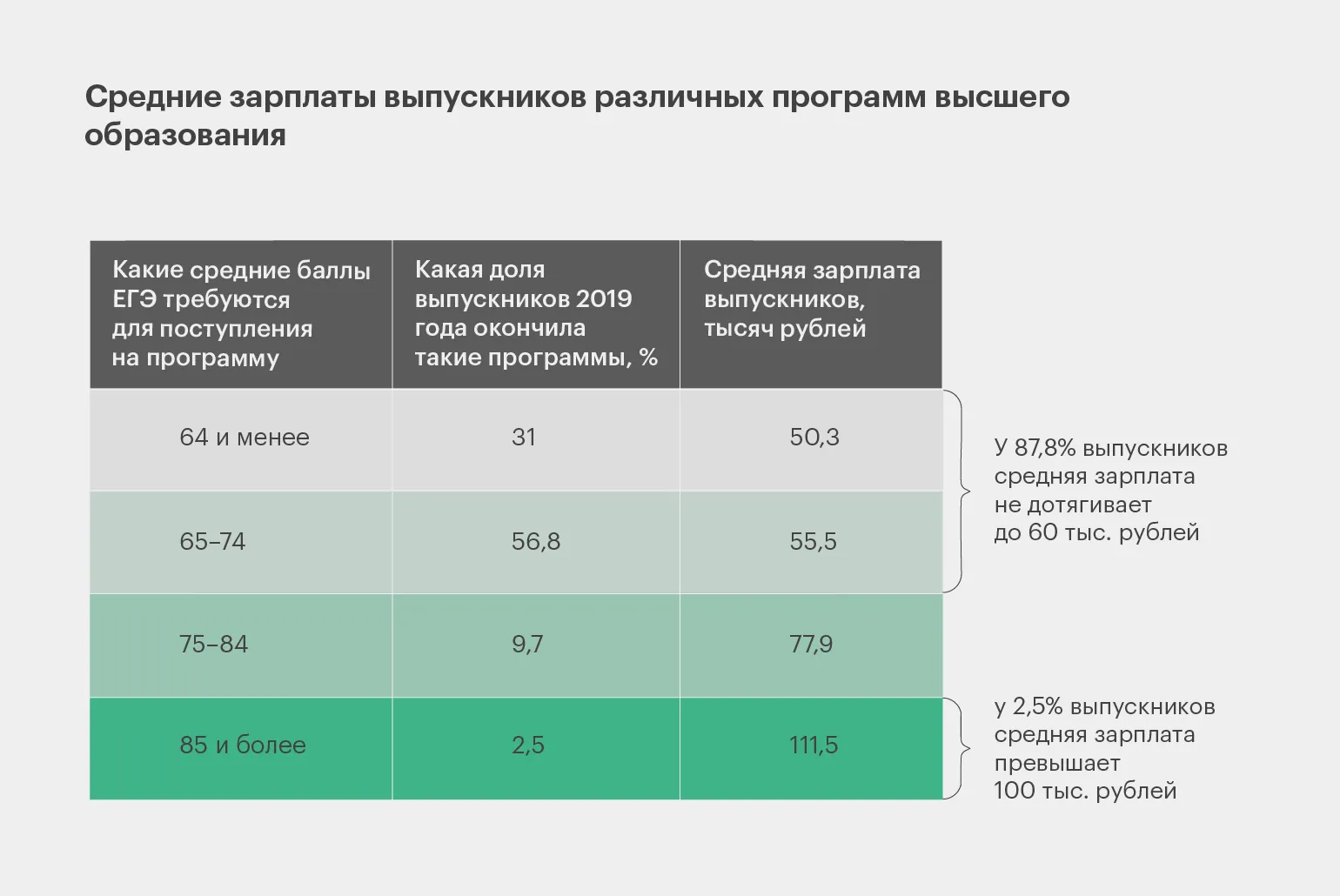 Исследования показывают, что средняя заработная плата выпускников образовательных программ напрямую зависит от баллов ЕГЭ, полученных при поступлении. В 2021 году выпускники программ, на которые поступают абитуриенты с высокими баллами, зарабатывали в два раза больше, чем их коллеги, обучавшиеся на менее конкурентных направлениях. Этот факт подчеркивает важность выбора учебной программы и уровня подготовки при поступлении в вуз и может служить значительным фактором в формировании карьерных перспектив выпускников.