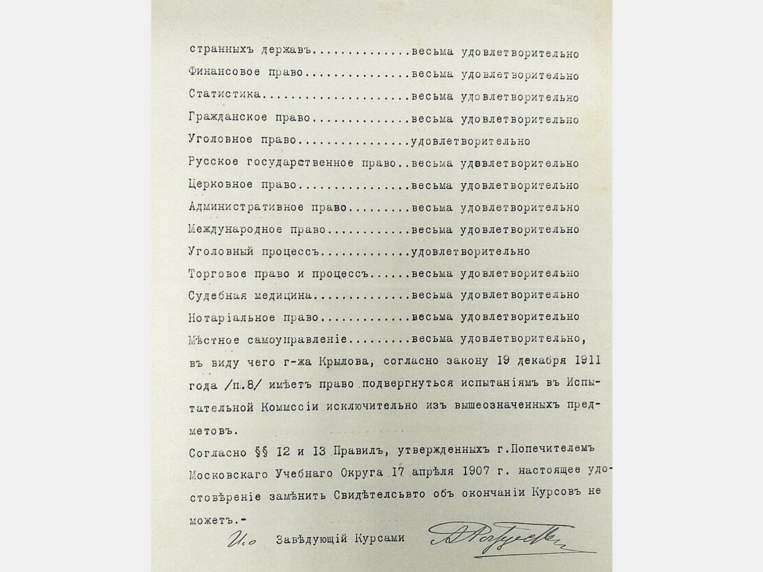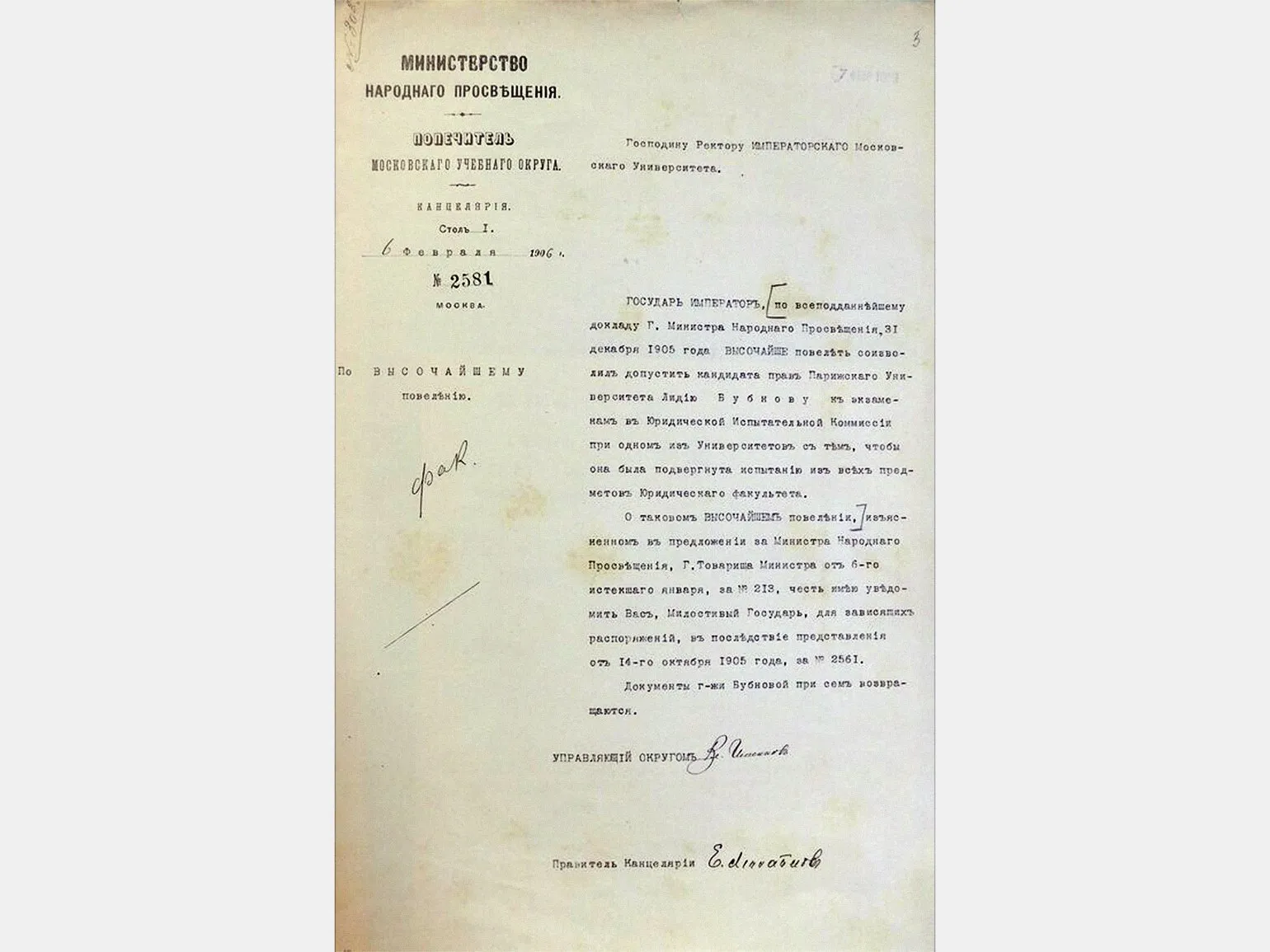 Уведомление ректора Московского университета от 6 февраля 1906 года о высочайшем соизволении Лидии Бубновой сдать экзамены в юридической испытательной комиссии Московского университета. Лидия Бубнова окончила юридический факультет в Париже и успешно сдала экзамены в испытательной комиссии Московского университета Изображение: Центральный государственный архив г. Москвы