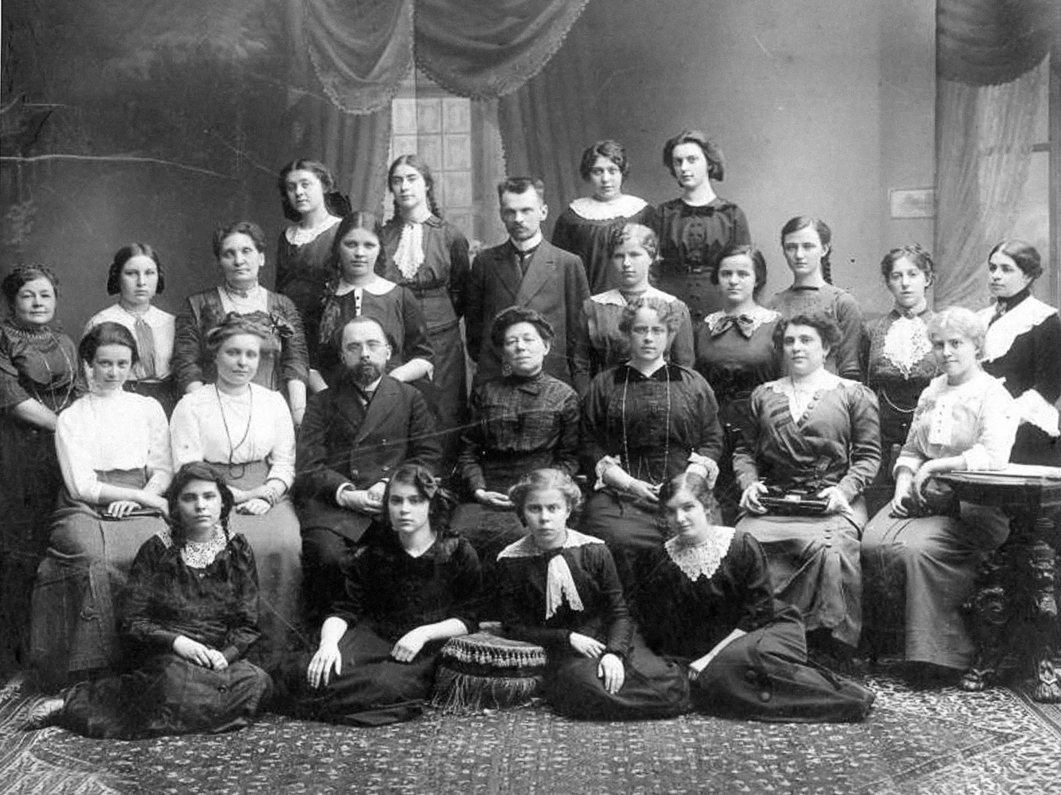 Группа слушательниц женского педагогического института, открытого в 1903 году в Петербурге. В центре — директор института историк С. Ф. Платонов. Санкт-Петербург, 1906 г. Фото: Станислав Полонский / МАММ / МДФ / «История России в фотографиях»