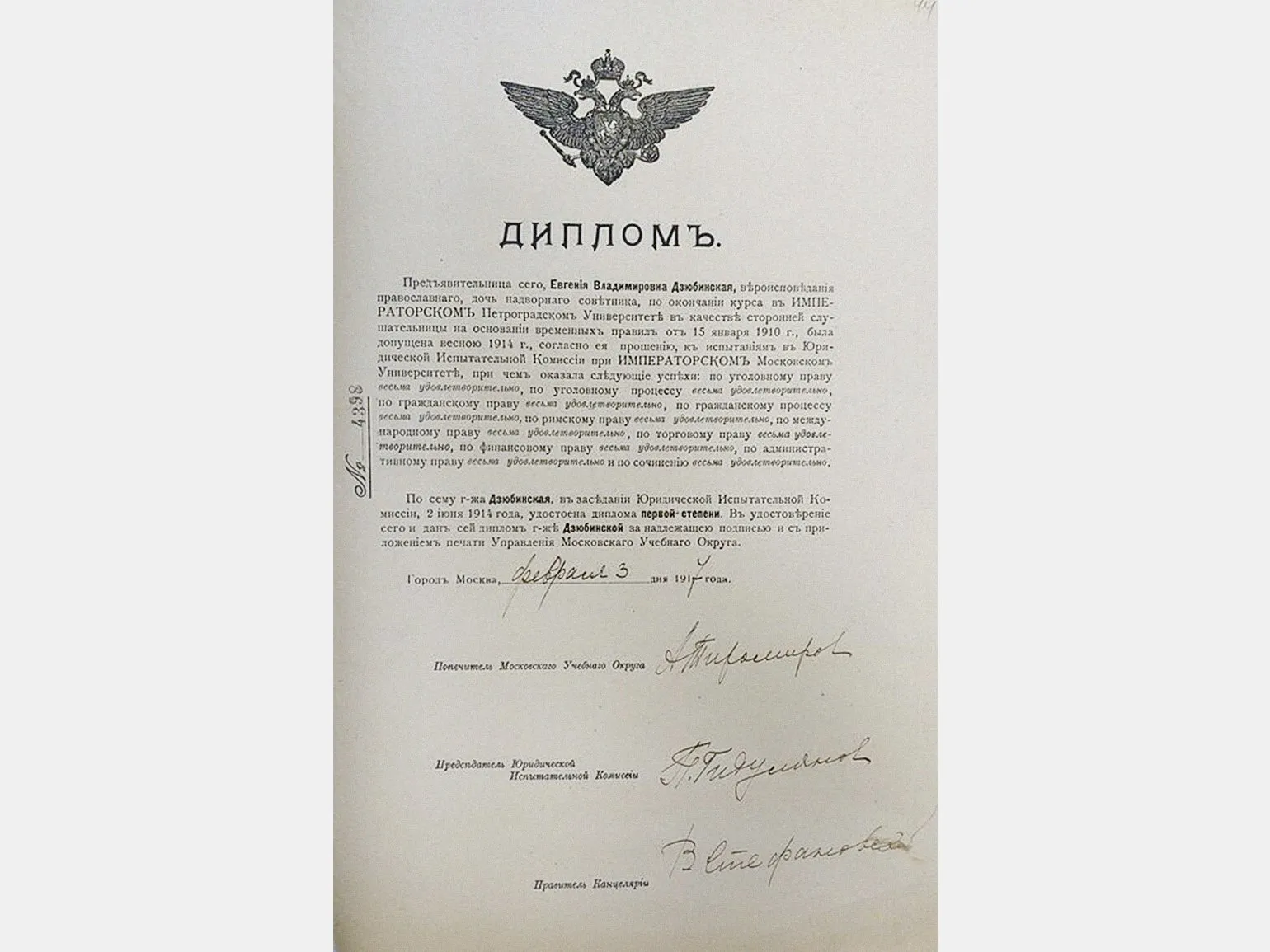 Диплом Евгении Дзюбинской, выданный после экзаменов в испытательной комиссии Московского университета Изображение: Центральный государственный архив г. Москвы