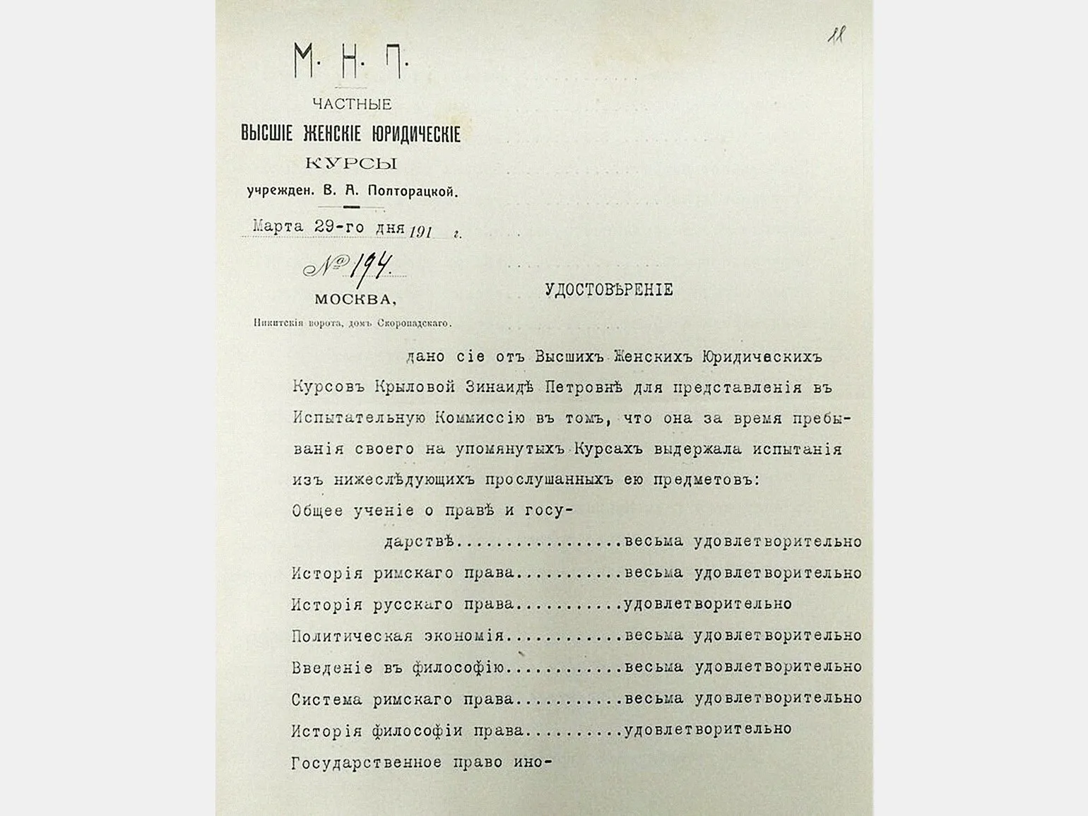 Евгения Дзюбинская, дочь депутата Государственной думы III и IV созывов В. И. Дзюбинского. Училась вольнослушательницей на юридическом факультете Санкт-Петербургского университета. Получив по высочайшему соизволению допуск к итоговым экзаменам в юридической испытательной комиссии, сдавала их не там, а в Московском университете. Испытания Дзюбинская успешно прошла в 1914 годуФото: Центральный государственный архив г. Москвы