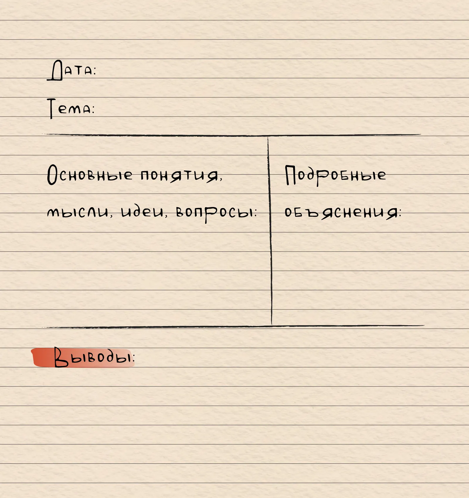 - Нижний блок (5–6 строчек) отделите горизонтальной линией, там в течение 24 часов после лекции запишите своими словами краткие выводы или самую важную мысль из колонок выше.