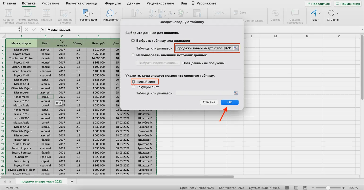 - диапазон данных в исходной таблице, который будет использоваться для сводной таблицы;