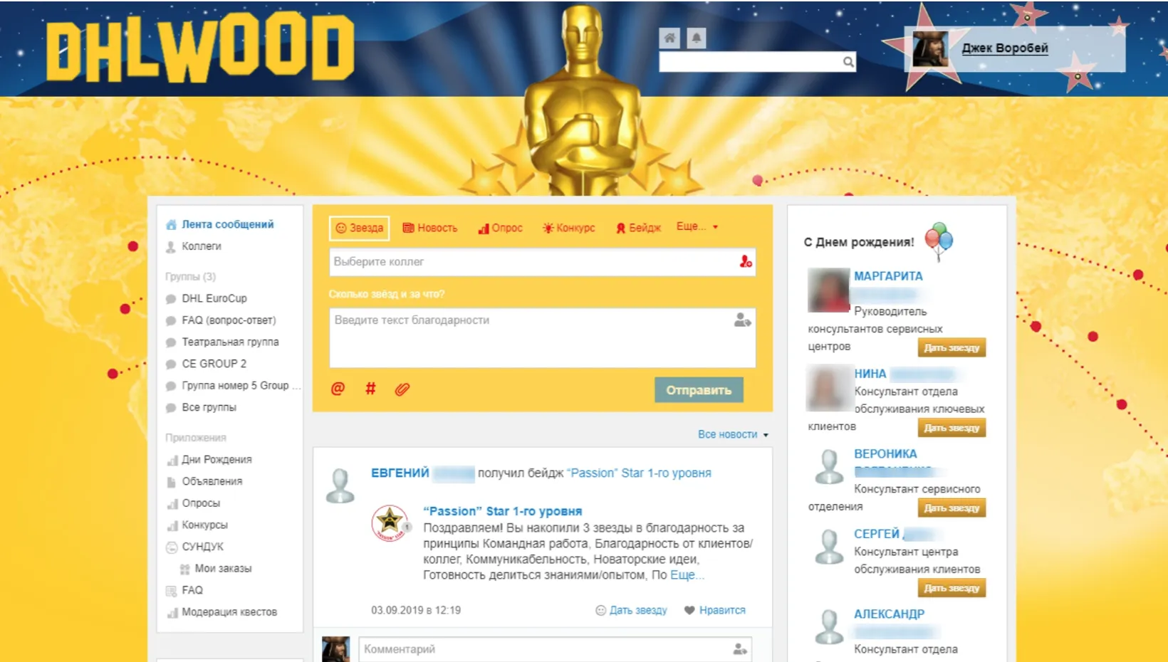 У компании DHL Express имеется множество подразделений и представительств в различных городах. Например, департамент по обслуживанию клиентов располагает двумя крупными контактными центрами, а также сервисными отделениями по всей территории России. Для улучшения взаимодействия между сотрудниками из разных регионов была создана внутренняя социальная сеть DHLWOOD. Эта платформа позволяет эффективно обмениваться информацией, укрепляет командный дух и повышает уровень сотрудничества среди сотрудников, что в свою очередь способствует улучшению качества обслуживания клиентов.