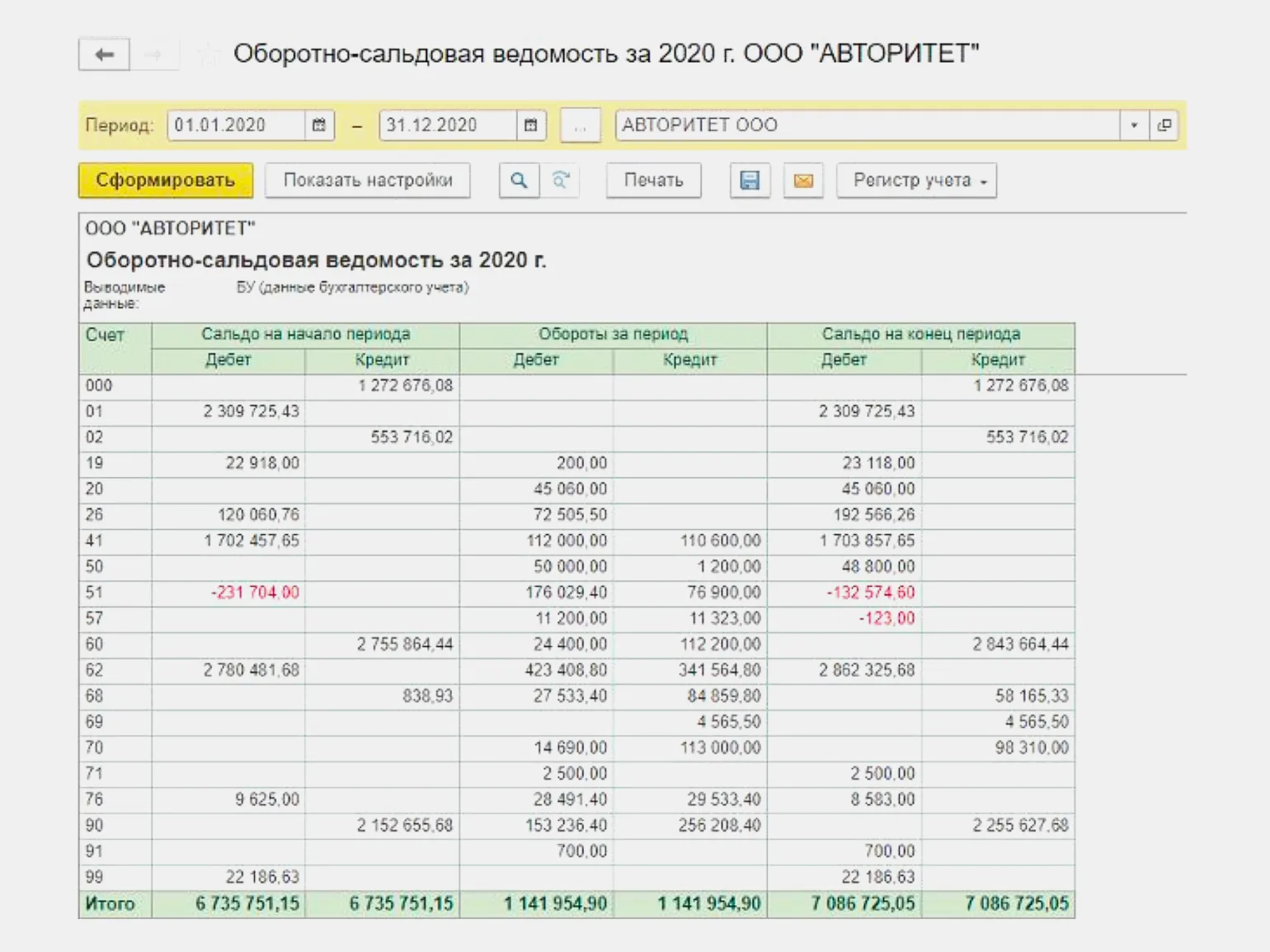 Ниже представлен пример оборотно-сальдовой ведомости ООО «Авторитет» за 2020 год, сформированной автоматически в программе «1С:Бухгалтерия».