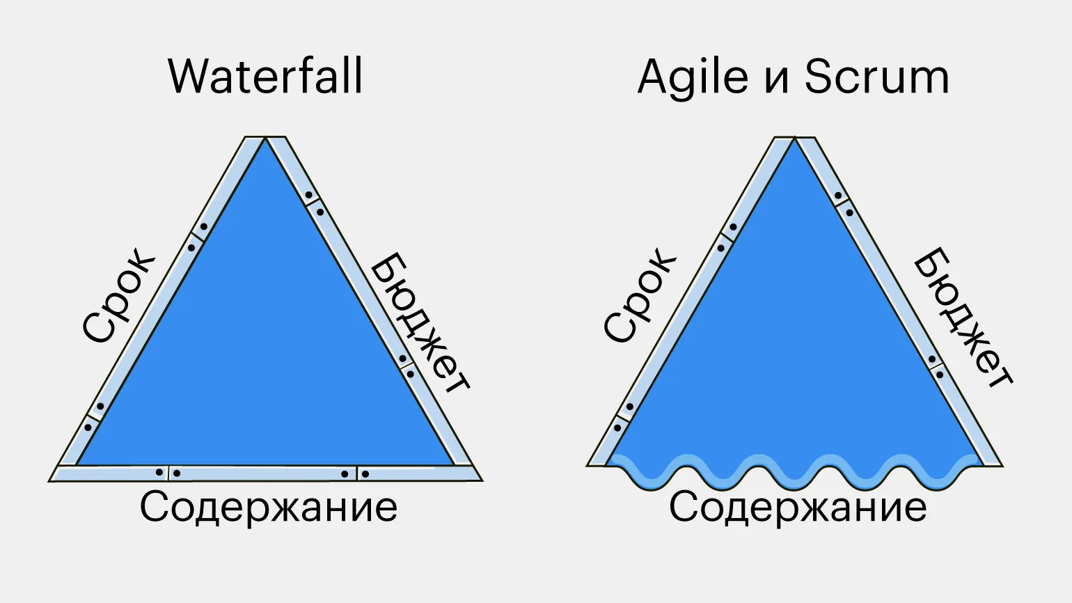 В методологии Waterfall проектный треугольник рассматривается как «жесткий» или «железный». Ключевым элементом этого треугольника является «Содержание», которое определяет конечный вид продукта. Изменения в данном параметре происходят крайне редко. В случае необходимости внесения изменений проектный менеджер устанавливает новые ограничения и документирует их для команды, что обеспечивает четкость и предсказуемость в процессе разработки.