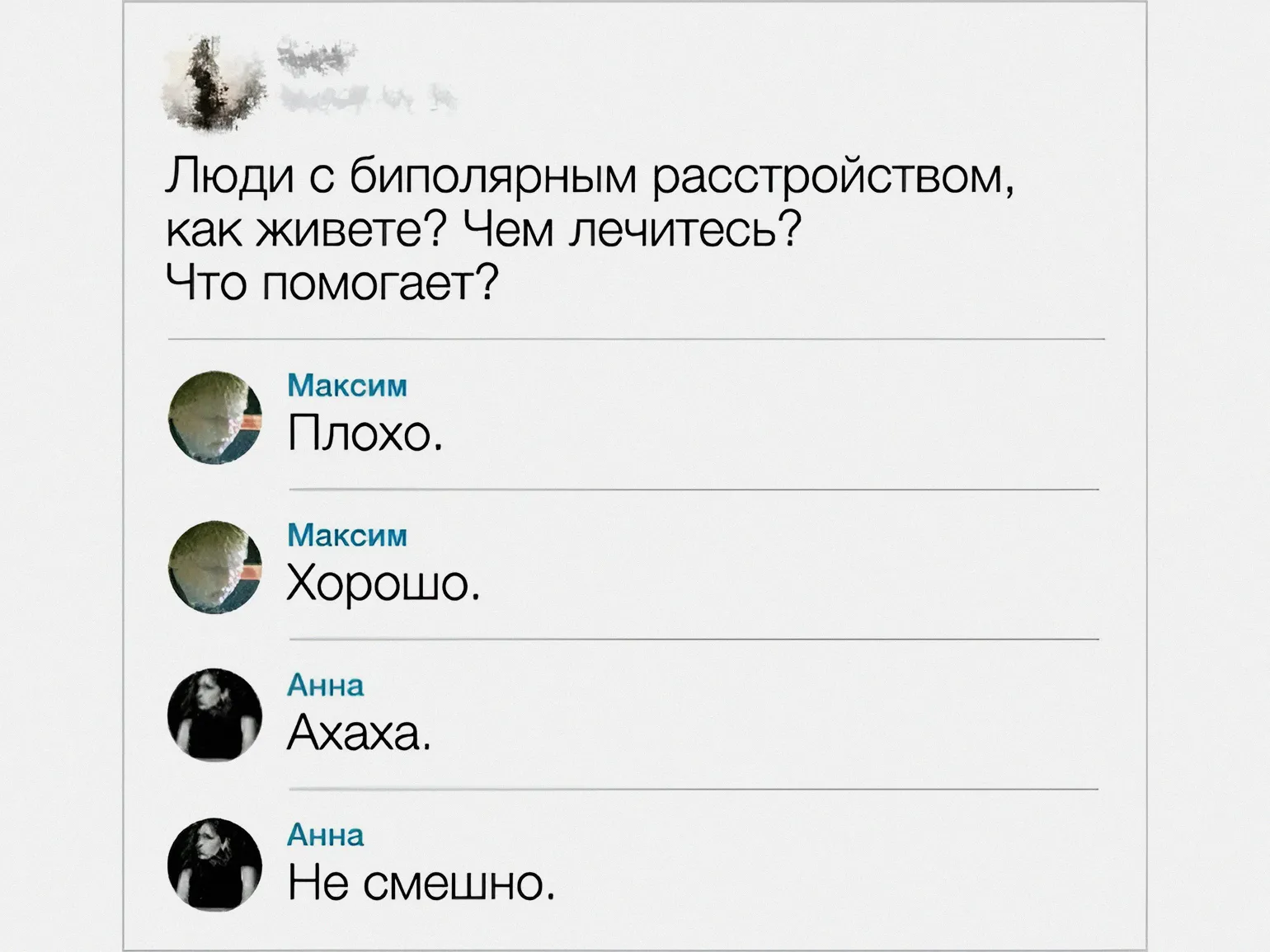 Лекарства могут сделать жизнь менее яркой и привлекательной. Однако такие «серые» периоды дают возможность осознать и почувствовать свою стабильность, установить условную норму. В моменты депрессивного отчаяния или в минуты маниакального подъема важно напоминать себе: «Стоп. Я знаю, что может быть иначе». Это осознание позволяет преодолеть трудные времена и вернуться к более ярким ощущениям жизни.