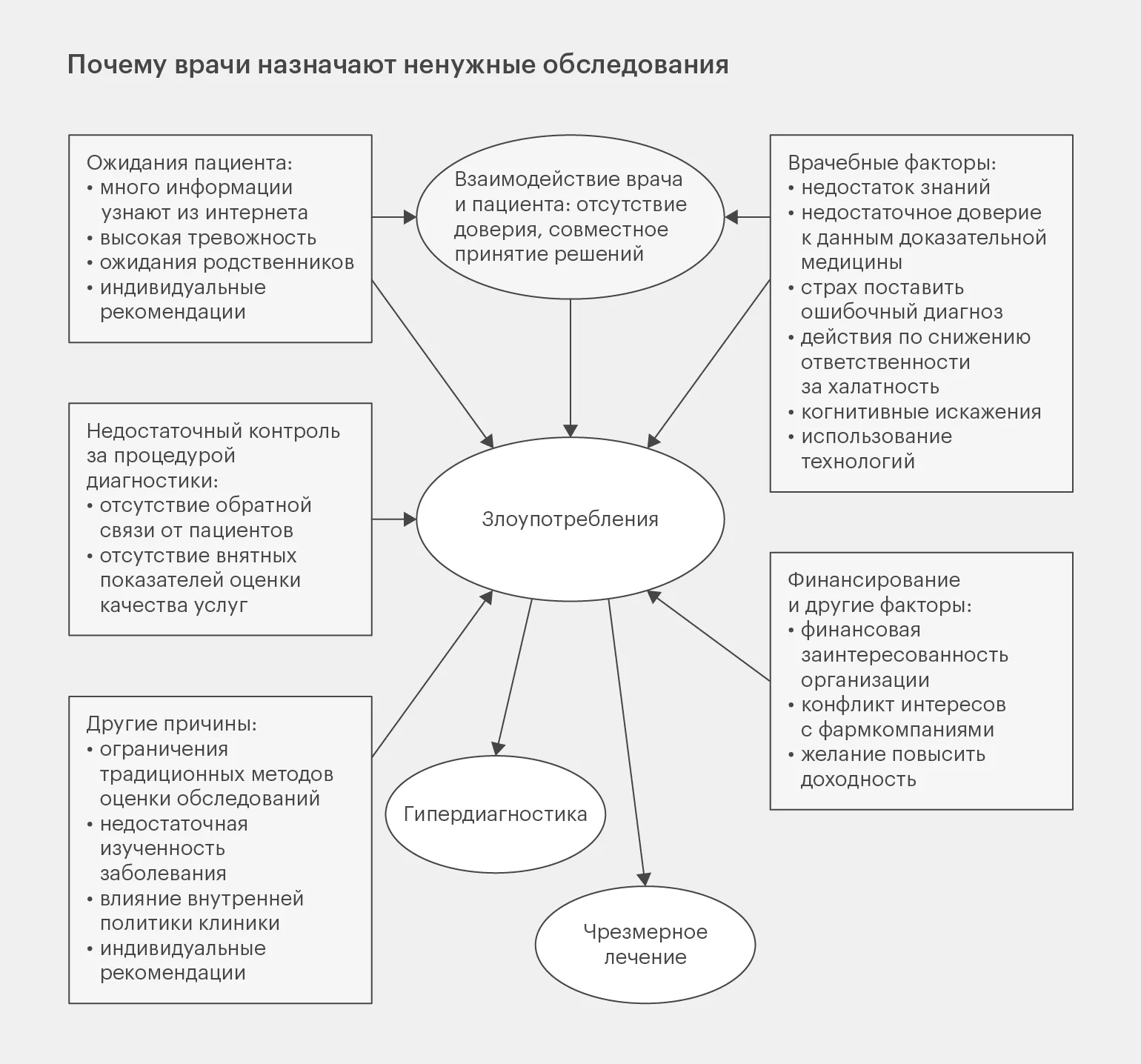 Некоторые врачи могут назначать ненужные обследования в поисках финансовой выгоды, однако это не единственная причина. Часто они поддаются давлению со стороны пациентов и их родственников, которые не имеют достаточной информации о процедуре или опасаются ошибочно диагностировать заболевание, что может навредить пациенту. Важно понимать, что такие действия могут привести к гипердиагностике, что в свою очередь увеличивает риски для здоровья. Для более детального изучения причин гипердиагностики и их последствий смотрите инфографику ниже.