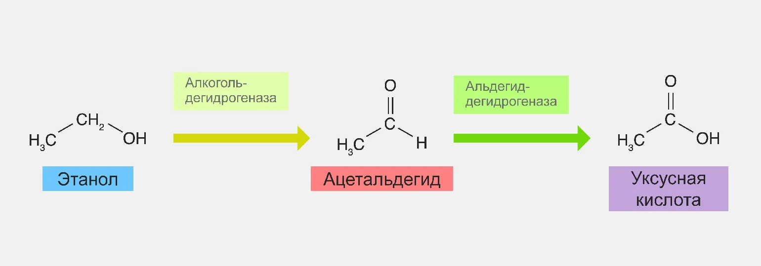Схема двухэтапного метаболизма этанола под действием ферментовИнфографика: aiyoshi597 / Shutterstock / djurga / Skillbox Media