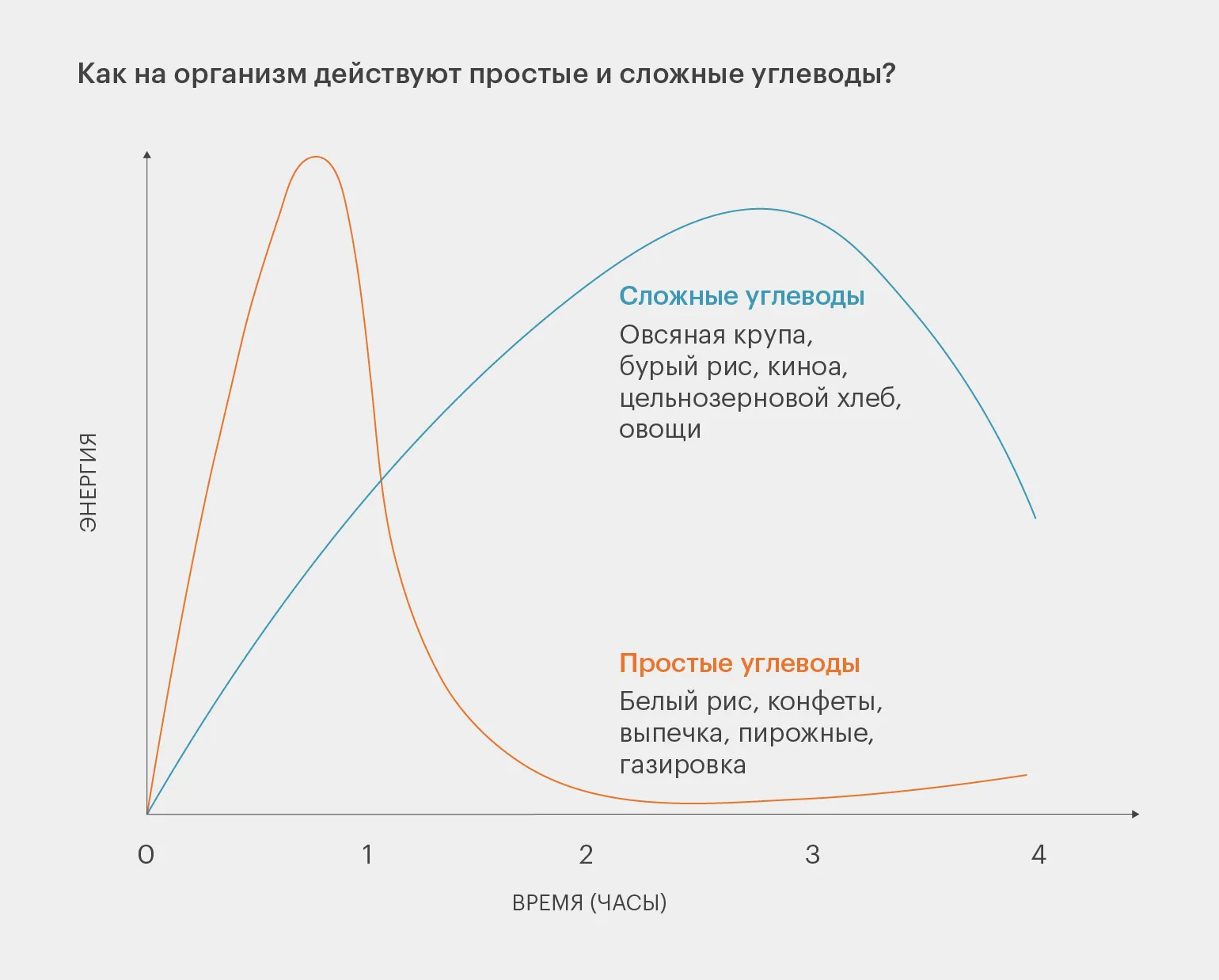 • Сложные углеводы — это вещества, состоящие из нескольких молекул простых углеводов, на расщепление которых организм будет затрачивать энергию. При поступлении сложных углеводов происходят дополнительные биохимические процессы, глюкоза поступает в кровь и в мозг медленно. Поэтому сохраняется длительное чувство насыщения. Недостаток сложных углеводов в рационе частично объясняет тягу к сладкому.