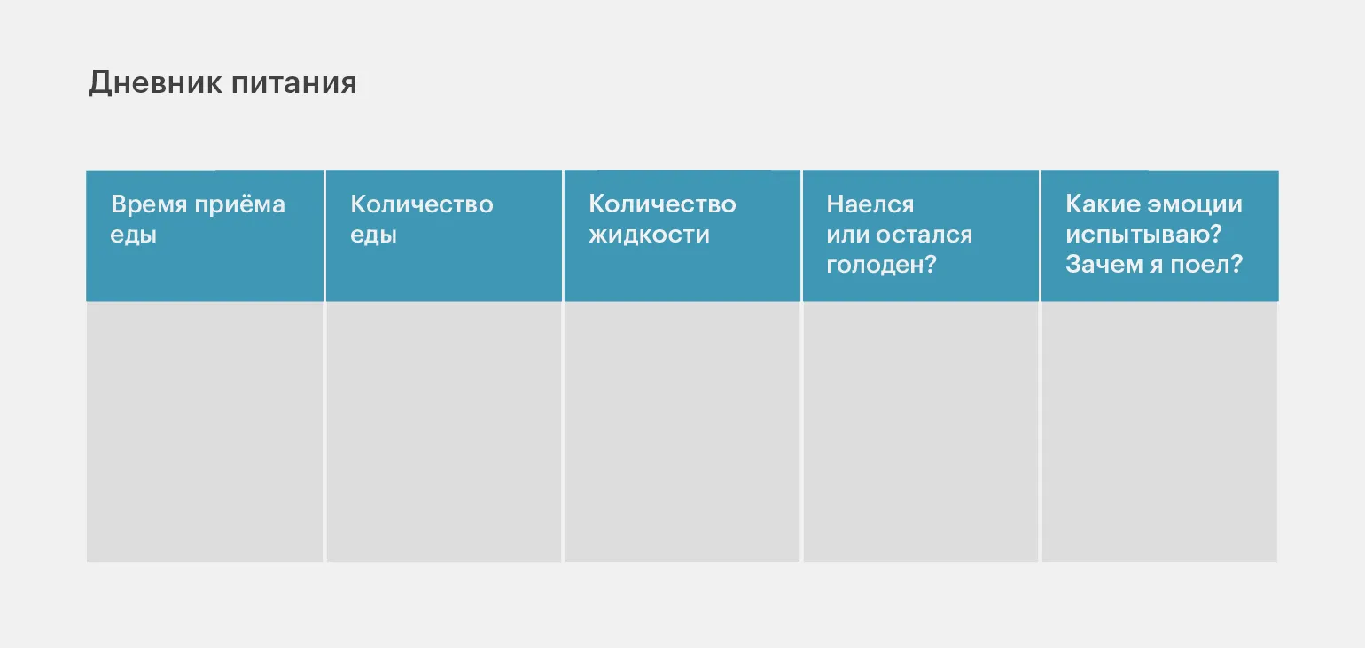 • Ведение пищевого дневника. В него нужно честно записывать, что и когда вы едите. Потом дневник анализируют самостоятельно или со специалистом и выявляют отклонения или нарушения по времени, объёму и качеству еды.