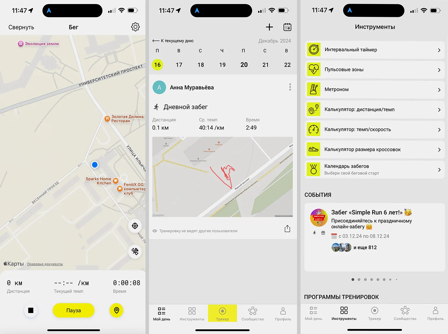 Приложение Simpla предоставляет возможность отслеживать пробежки, включая дистанцию, продолжительность, маршрут на карте и темп. Пользователи найдут полезные инструменты как для начинающих, так и для опытных бегунов, такие как метроном, калькулятор для перевода темпа в скорость и обратно, а также калькулятор размеров кроссовок для различных стран. Кроме того, Simpla предлагает готовые программы тренировок, а также возможность создать индивидуальный план. Пользователи могут настроить напоминания о запланированных пробежках, что помогает поддерживать регулярность тренировок и достигать поставленных целей.