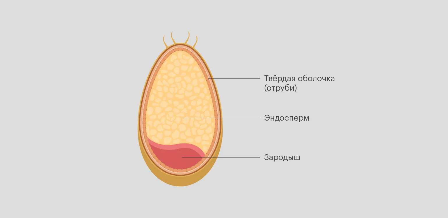 - Зародыш — источник полезных жиров, некоторых витаминов и минералов [7].